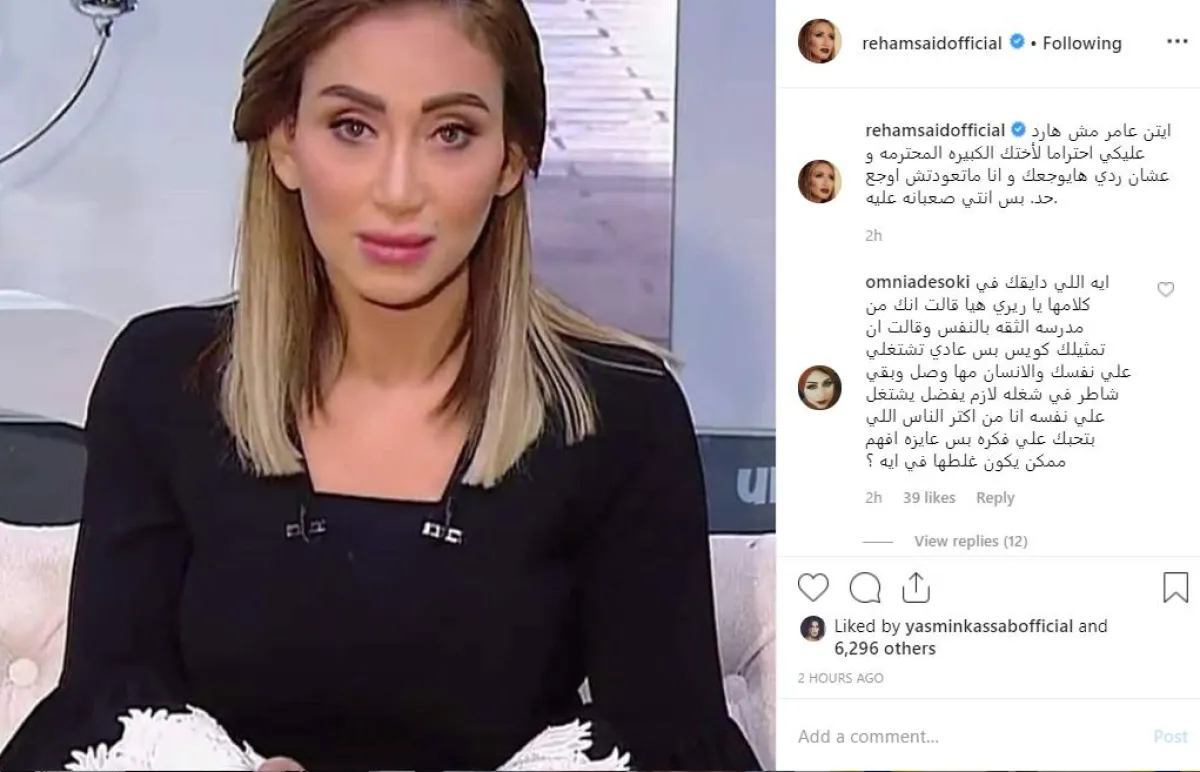 بعد دقيقة واحدة على إدلاء عامر لتصريحاتها، ردت الإعلامية ريهام سعيد عبر حسابها بموقع إنستقرام قائلة: أيتن عامر مش هرد عليكي احتراما لأختك الكبيرة المحترمة .. وعشان ردي هيوجعك وانا ماتعودتش أوجع حد .. بس أنت صعبانة عليا.