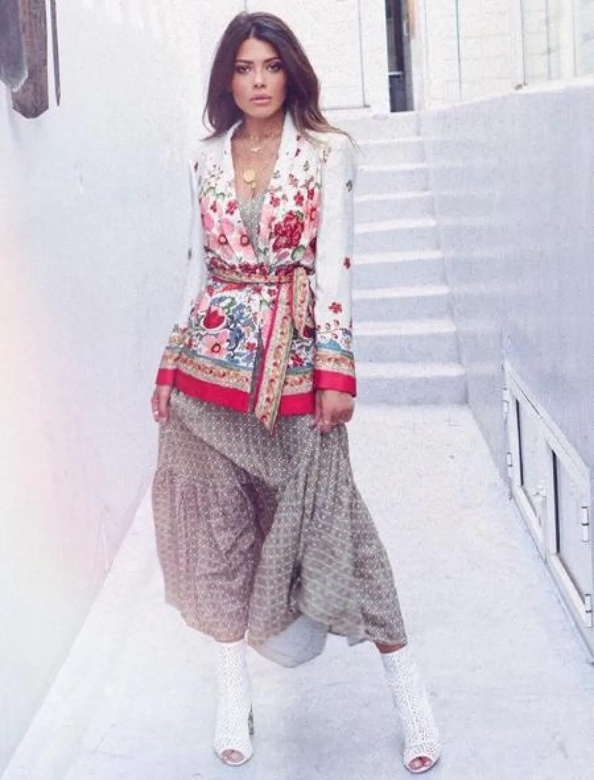 تنسيق مميز اعتمدته فوزازا اختارت فيه فستان ماكسي معرقًا باللونين البيج والأبيض، ونسقت من فوقه جاكيت بليزر باللون الأبيض، مُطبع برسومات الورود الملونة، وأكملت الاطلالة بحذاء كاحل باللون الأبيض من الشبك، ومجموعة من المجوهرات الذهبية اللافتة.