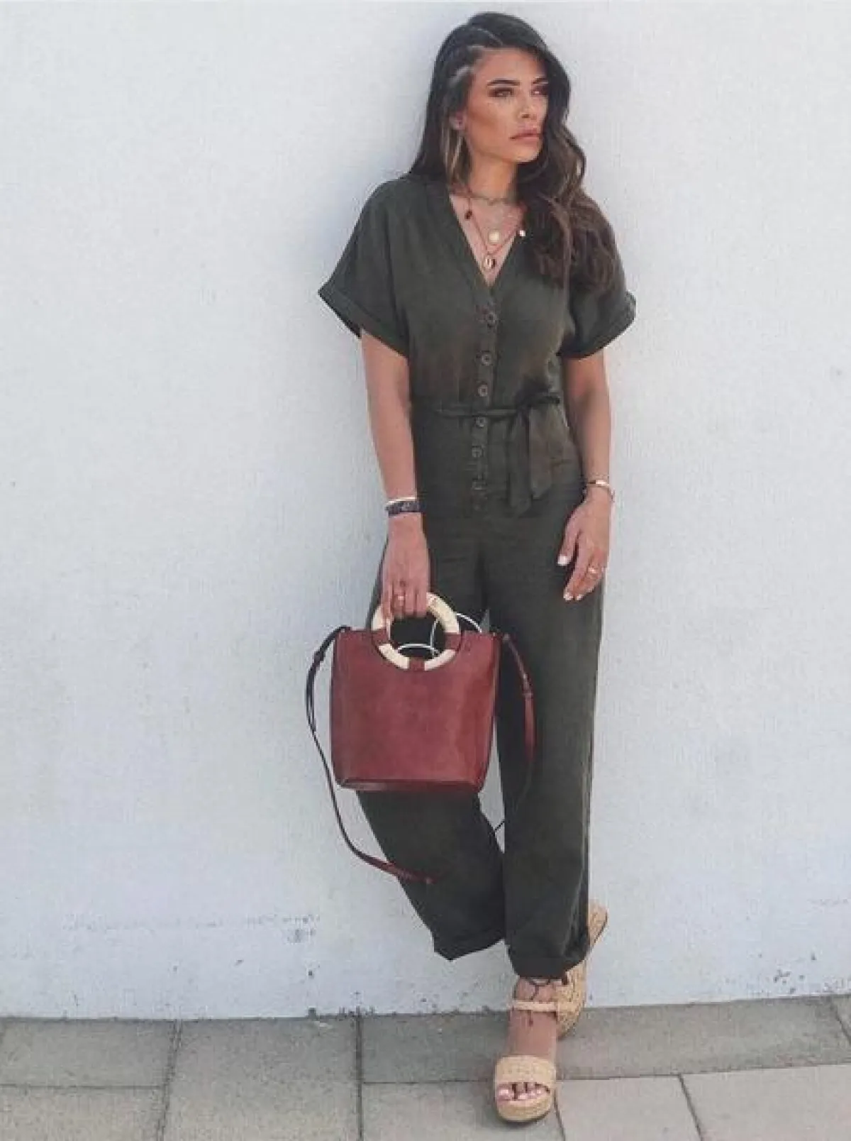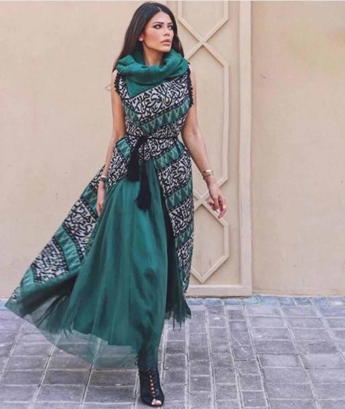 في اطلالة أنيقة مثالية أيضًا لمناسبات شهر رمضان، اختارت العنود بدر فستان ماكسي من قماش الشيفون باللون الأخضر الزيتي، من فوقه اعتمدت ما يشبه الجيليه الطويلة المطرزة بكتابات باللغة العربية، باللونين الأسود والأبيض، وقد زينت خصرها بحزام قماشي، وأكملت الاطلالة بحذاء كاحل أسود مزين بالربطات.