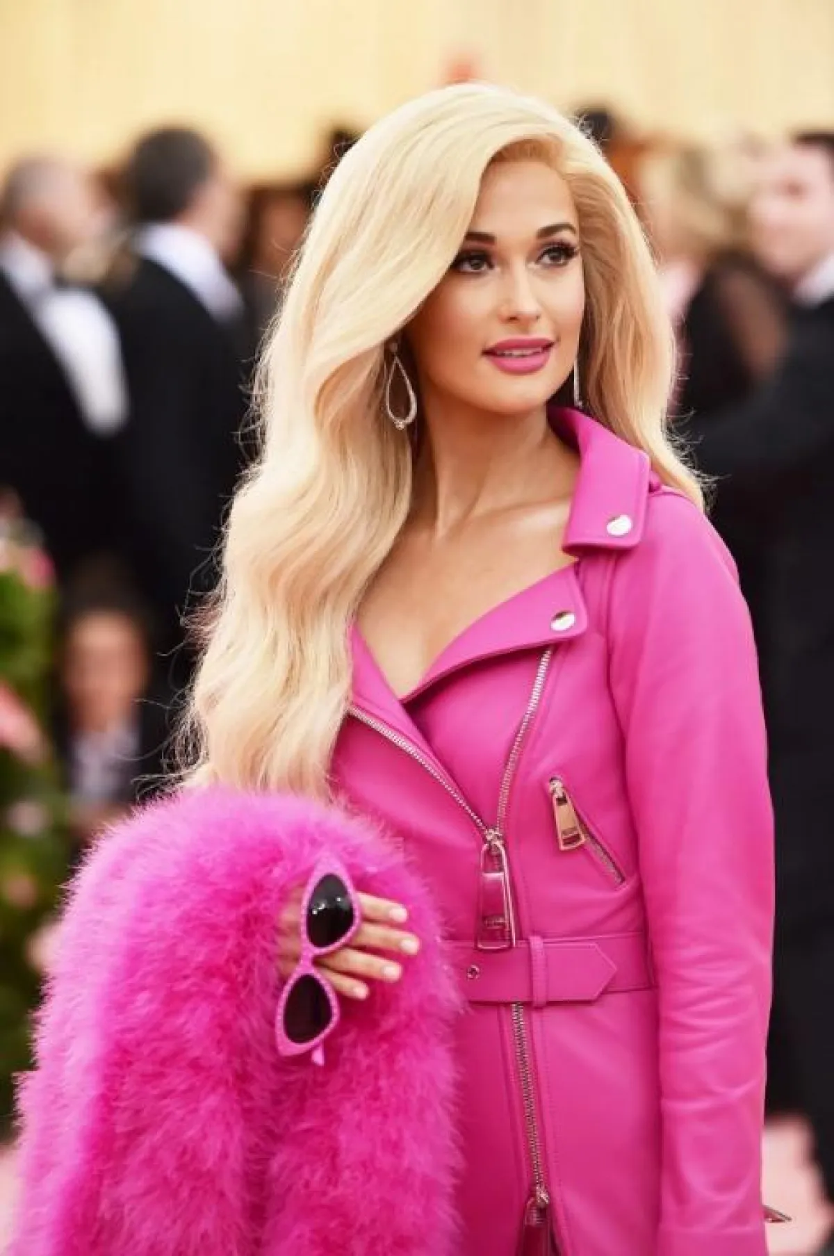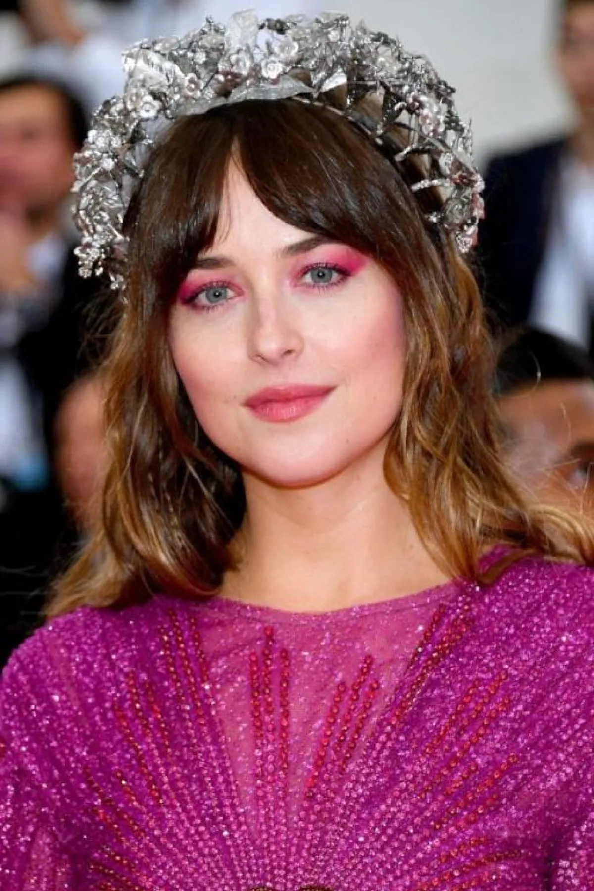 جمعت داكوتا جونسون اثنتين من أبرز صيحات الموسم الجديد، وهي نغمات وردية وتوهج شديد اللمعان. وقد تمّ تمرير نغمات الفوشيا على العينين والخدين والشفاه كجزء من المظهر الذي ابتكرته خبيرة المكياج ماكي ريوكي Maki Ryoke.