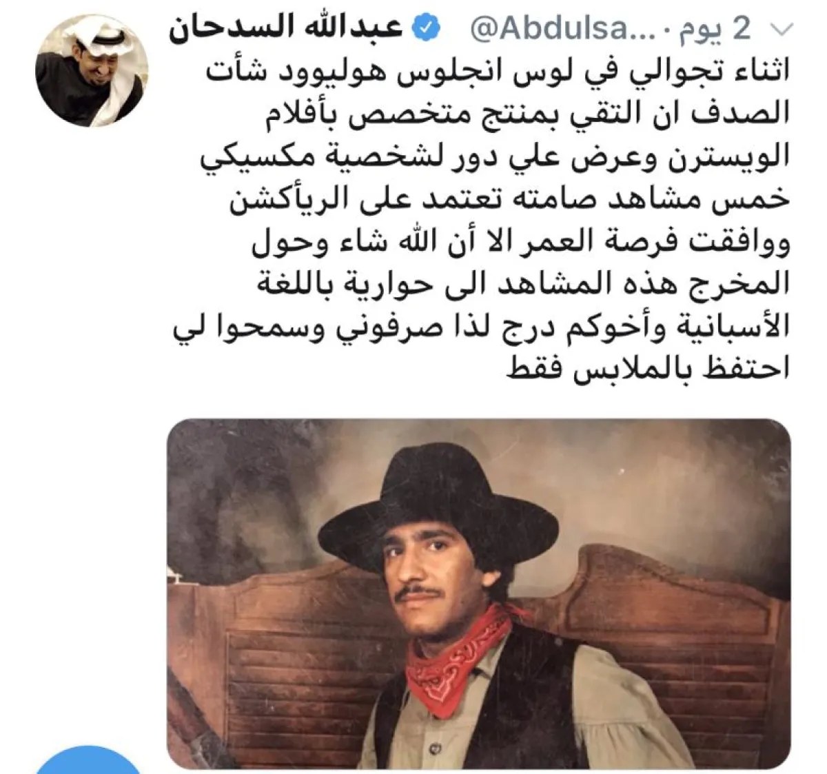 نشر نجم الدراما السعودية عبدالله السدحان صورةً له على موقع التواصل الاجتماعي تويتر، يظهر فيها يرتدي زي أفلام "الكاوبوي"، وقال: "أثناء تجولي في لوس أنجلوس، هوليوود، شاءت الصدف أن ألتقي منتجاً متخصصاً بأفلام الويسترن، وعرض عليَّ دور لشخصية مكسيكي من خمسة مشاهد صامتة، تعتمد على الري أكشن، ووافقت على فرصة العمر، لكنَّ الله شاء بأن يحوِّل المخرج هذه المشاهد إلى مشاهد حوارية باللغة الإسبانية، وأخوكم درج، لذا صرفوني، وسمحوا لي بالاحتفاظ بالملابس فقط".