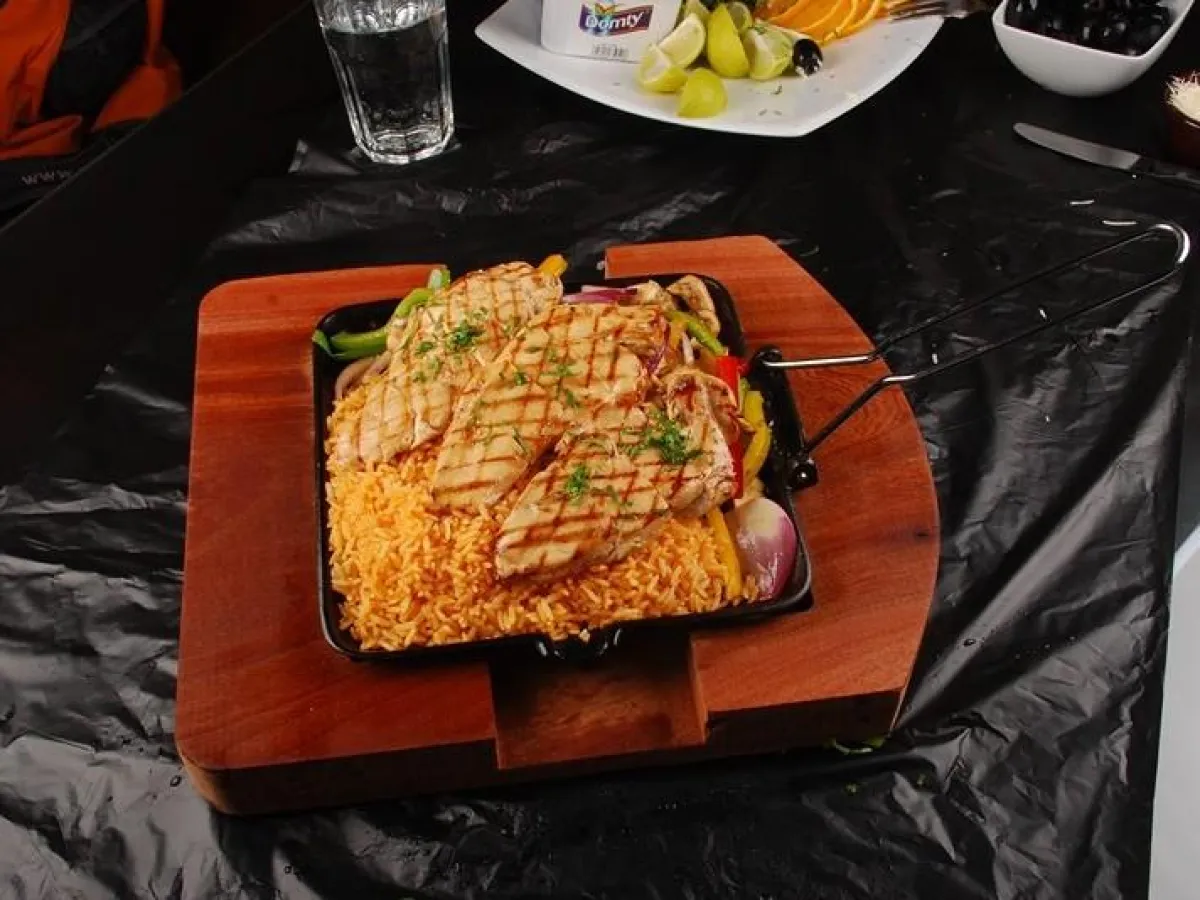 2-ضعي الأرز المكسيكي بعد تسويته على طبق التحضير ثم ضعي عليه صدور الفراخ، وصبي عليها الصوص الأبيض.