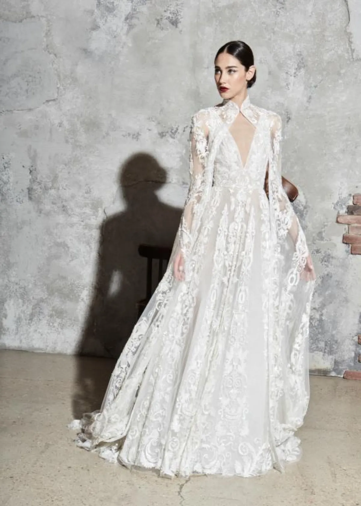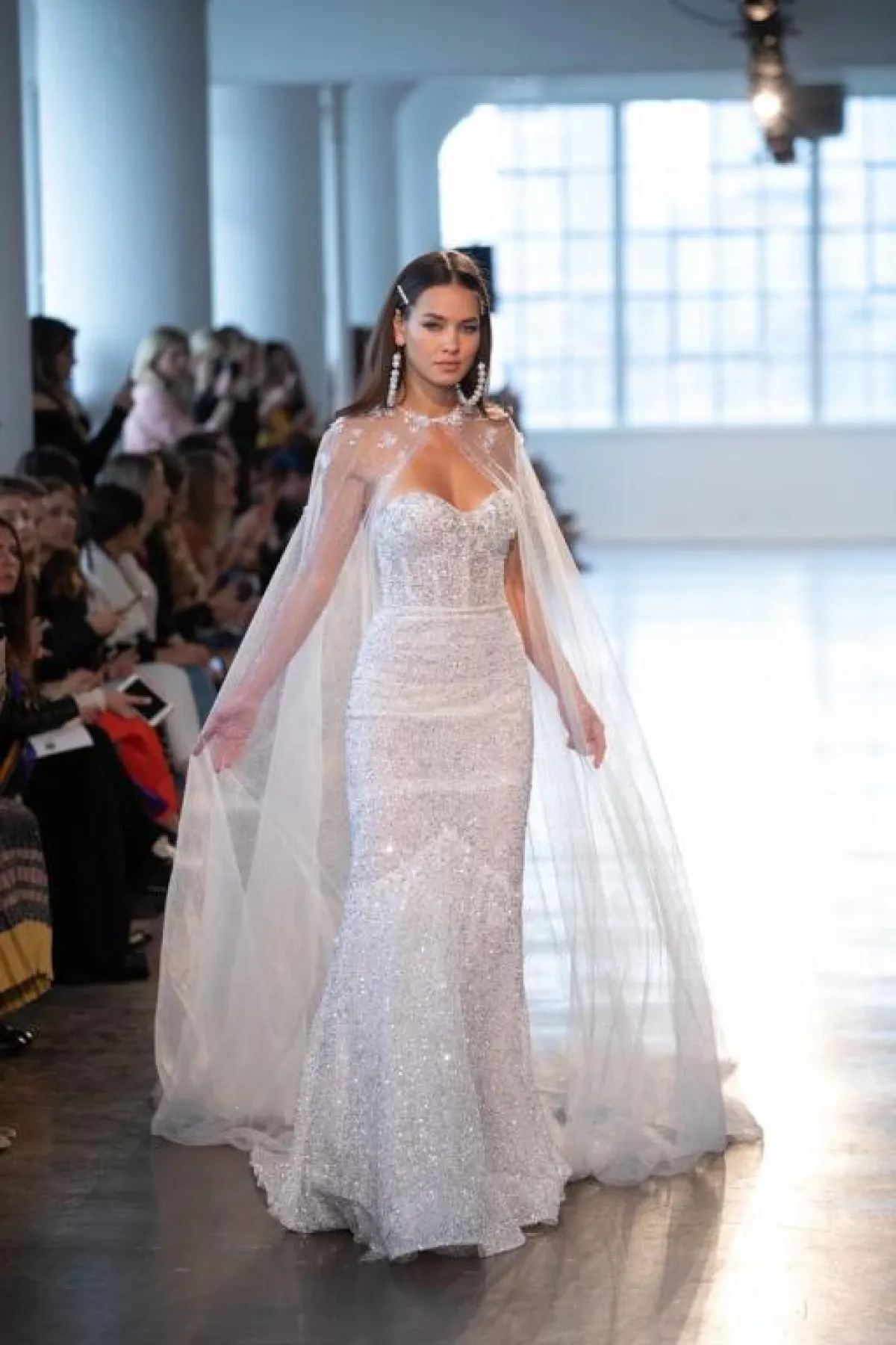 قدمت ماركة آن بيرغ Anne Barge فستان زفاف أنيق مع سترة طويلة مفتوحة من الأمام، وتميز التصميم بالكلاسيكية والرقي.