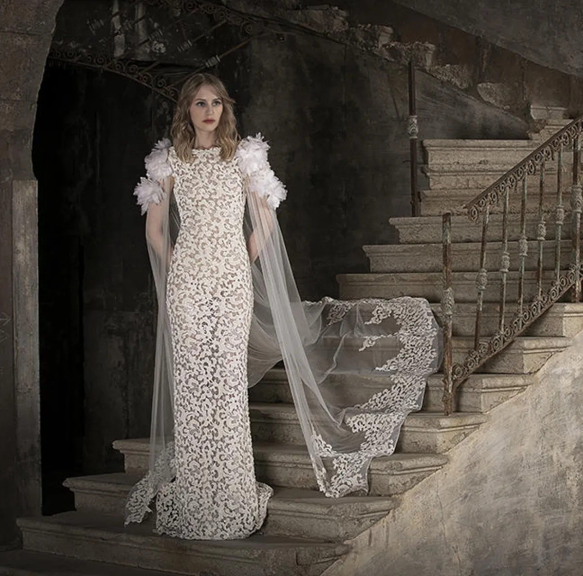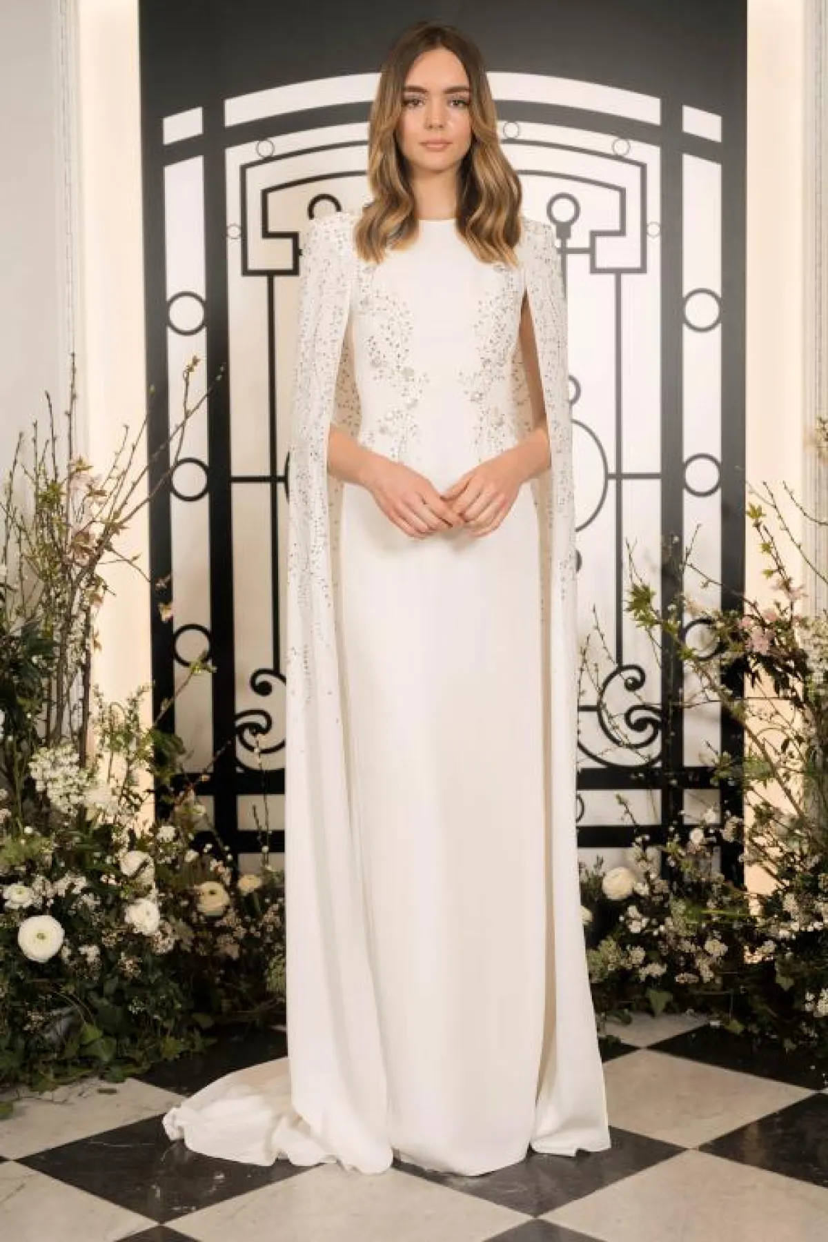 قدم المصمم طوني ورد فستان زفاف مزود بسترة طويلة من التول ومزينة بالورود البارزة على الأكتاف، مع فستان زفاف بقصّة عمودية.