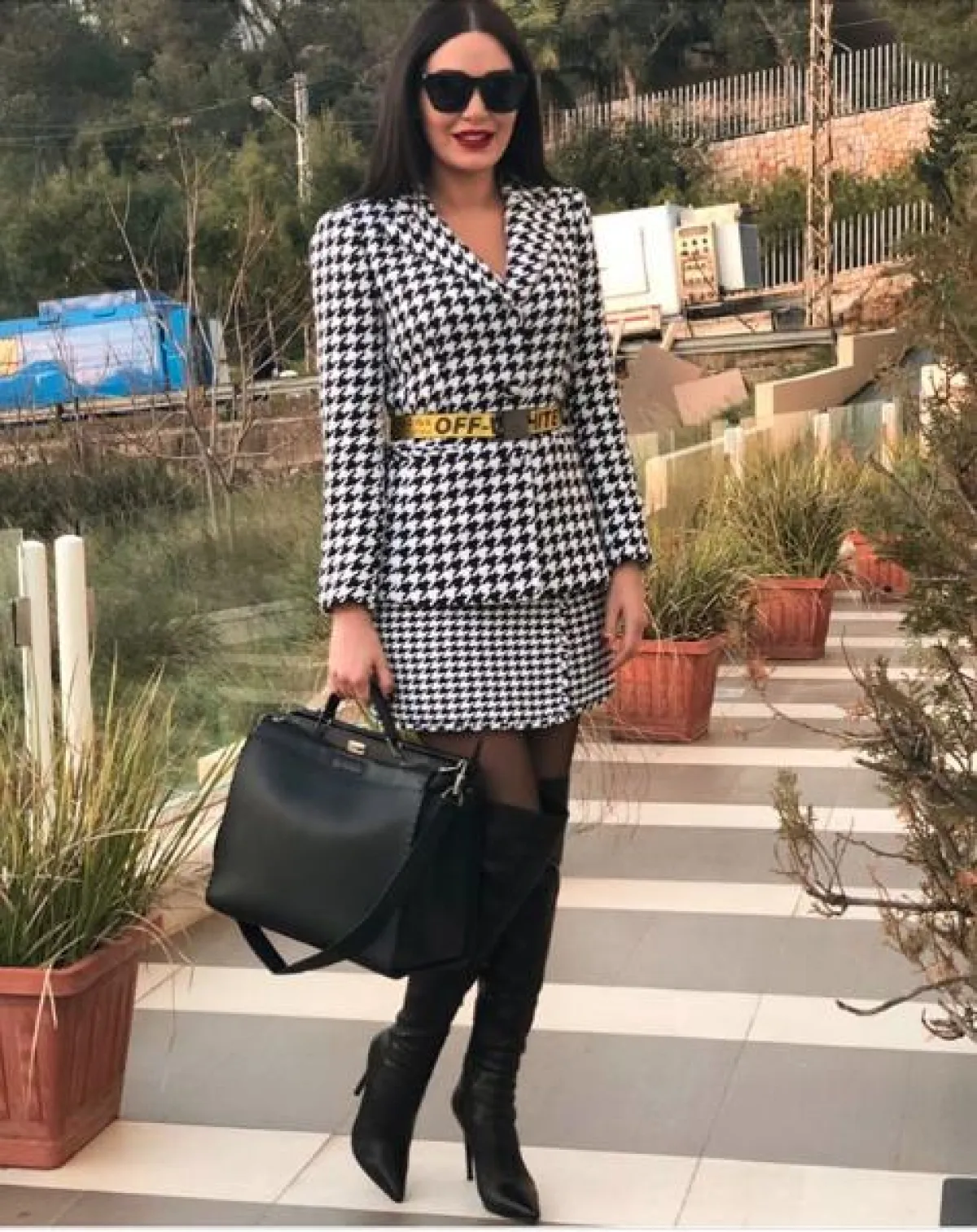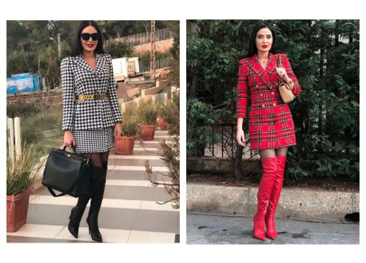 اختارت سيرين عبد النور في هذا اللوك، فستانًا قصيرًا بنقشة الكارو بقصة البليزر مع صفّي أزرار، ونسقت معه جزمة عالية من الجلد يصل طولها حد أعلى حد الركبة، وشنطة يد من الجلد باللون البيج من “غوتشي” Gucci، وبرأيي أنّ اللوك ذكّرنا قليلًا باطلالات الكريسمس.