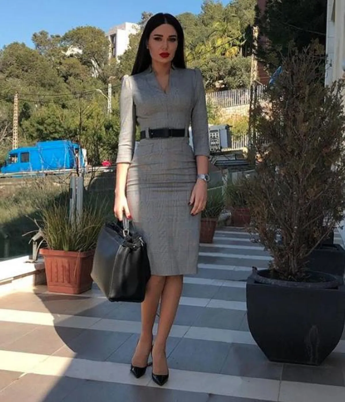 أحد أجمل اطلالات سيرين عبد النور في المسلسل حتى الآن برأيي، ولا سيّما أنها مثالية لدورها كإعلامية، في هذا الفستان الميدي باللون الرمادي وبقَصّته الضيّقة التي ناسبت قوامها الممشوق، وقد زينت خصرها بحزام باللون الأسود وأكملت اللوك بشنطة يد كبيرة من الجلد، وحذاء بكعب عالٍ باللون الأسود.