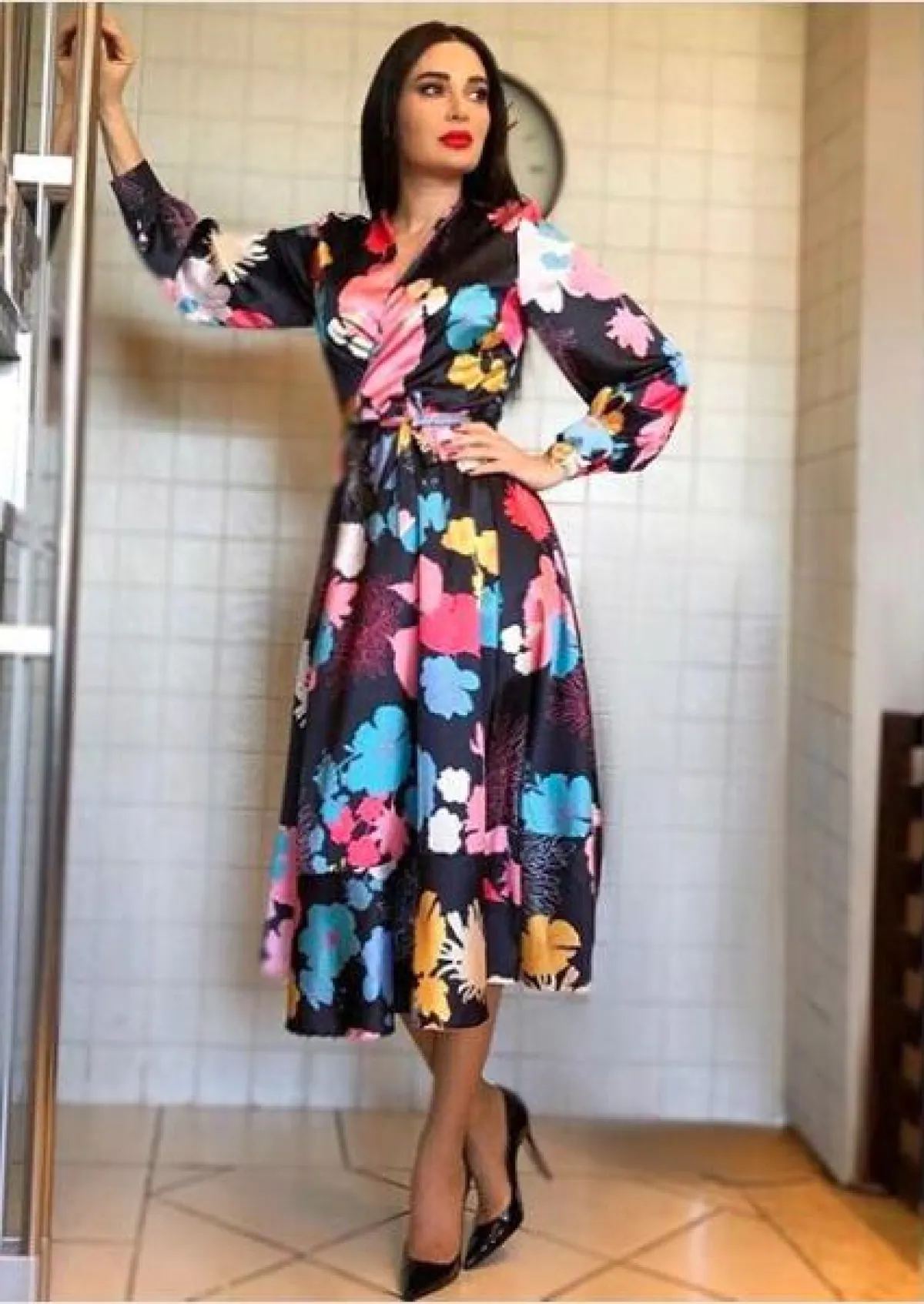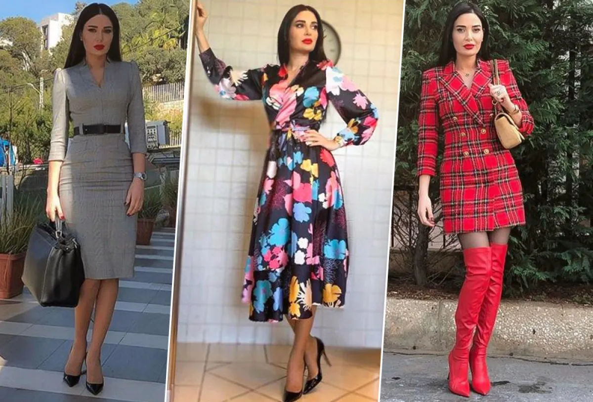 لوك مختلف اعتمدته سيرين عبد النور هذه المرة، حيث اختارت فستان ميدي باللون الأسود معرقًا برسومات الورود الملونة، تصميم الفستان ناعم يلتف حول الجسم مع أكمام طويلة، وقد نسقت معه حذاءً بكعب عالٍ باللون الأسود بتصميم كلاسيكي.