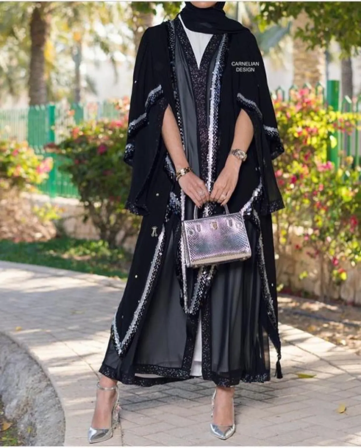 موضة الشيفون بموديلات العبايات لا تبطل موضتها على الإطلاق، لكنها تتجدد بشكل دائم، سواء بالتطريزات او بالرسومات المختلفة، كالعبايه من كارنيلين ديزاين Carnelian Design مطرزة بالفضي اللامع، مناسبة لمشاوير ما بعد الظهر، مع كعب عال فضي وطرحة سوداء بسيطة ،لاسيما من الشيفون أيضا.