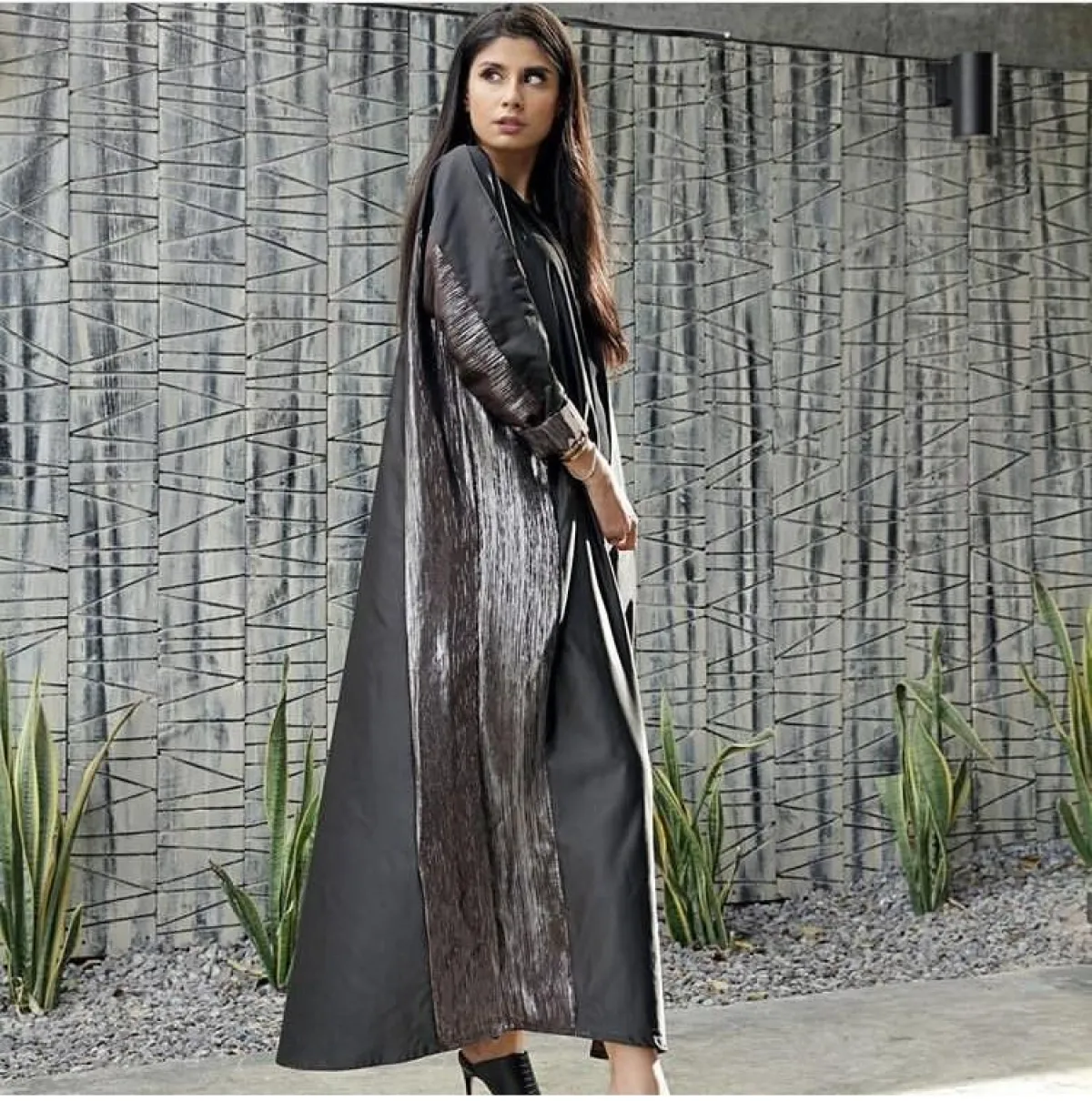 موضة الميتالك مازالت متربعة على عرش الموضة، فلم لا تختارينها بموديل عبايتك الكلاسيكية، كالعبايه من Rayanah Collection رايانا كولكشن، باللون الرمادي مع لمسةالميتالك على جانبي العبايه، نسقيها مع حجاب أبيض او روز ، وصندل مفتوح متدرج من ألوان العبايه.