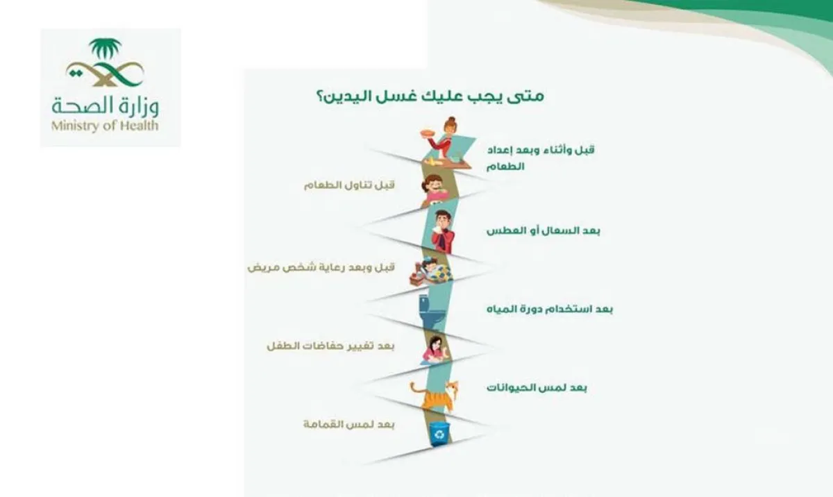 نشرت وزارة الصحة عبر حسابها الرسمي على موقع التواصل "تويتر" انفوجراف توضح من خلاله بعض الحالات التي يلزم فيها غسل اليدين، وذلك حفاظاً على الصحة العامة، ووقايةً من الأمراض، ومنعاً لانتقال العدوى.