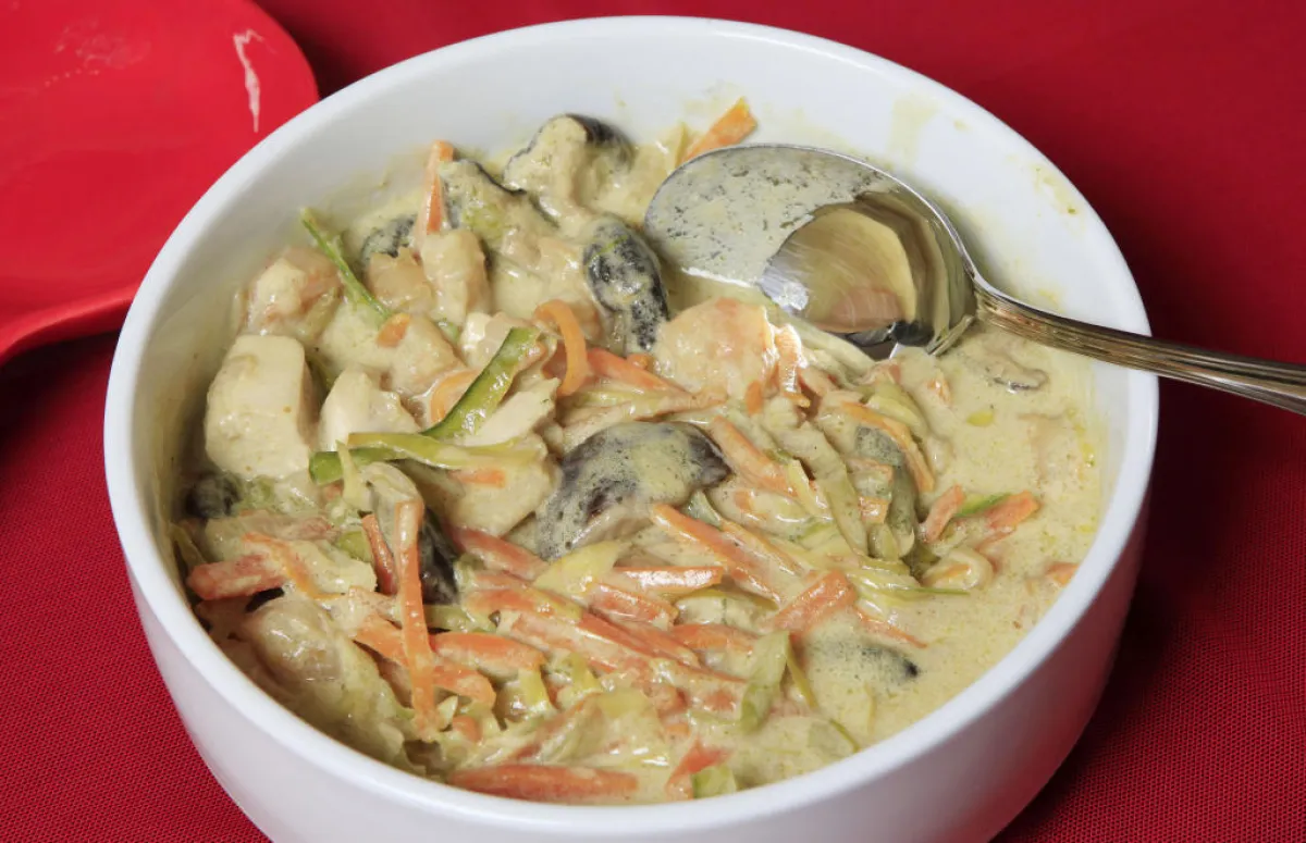 4- يُضاف حليب جوز الهند وصلصة الصويا والكزبرة والزنجبيل والدجاج والروبيان مع الملح والفلفل الأسود، ونتركها على نار خفيفة لمدة 10 دقائق، ويُقدّم.