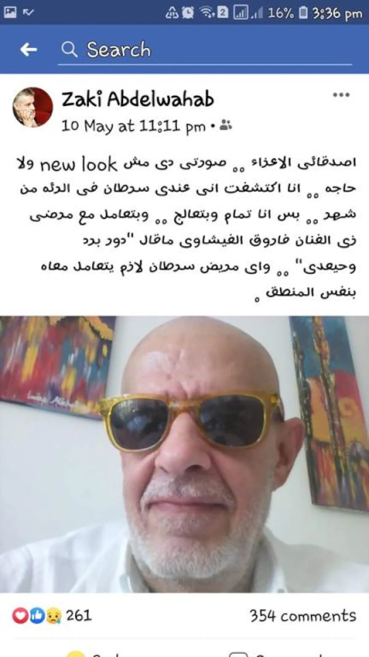 زكي ابن المطربة الراحلة ليلى مراد من المخرج الراحل فطين عبد الوهاب، والزوج السابق للنجمة الراحلة سعاد حسني، نشر صورة حديثة له بعدما حلق شعر رأسه بالكامل وعلق عليها عبر حسابه الرسمي بموقع الفيس بوك قائلاً: أصدقائي الأعزاء دي صورتي، دي مش نيولوك ولا حاجة، أنا اكتشفت إني عندي سرطان بالرئة من شهر بس، أنا تمام وبتعالج.
