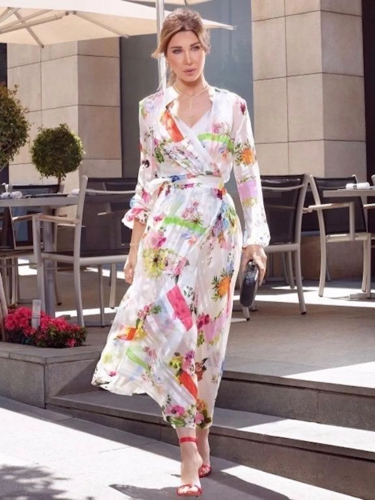 شاهدنا نانسي عجرم في أحد المشاوير الصباحية، وقد اختارت فستان ماكسي ناعمًا باللون الأبيض، معرقًا بالورود الملونة، أكمامه طويله ومحدد الخصر بحزام قماشي، وقد نسقت معه صندلًا بكعب عالٍ باللون الأحمر، وشنطة يد صغيرة باللون الأسود، واختارت بعض المجوهرات الناعمة.