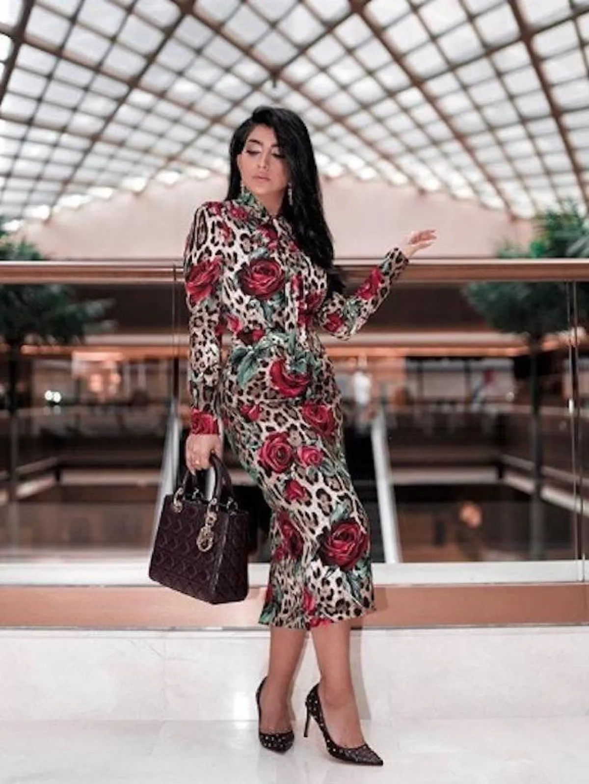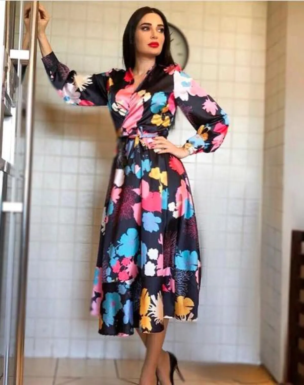 شاهدنا سيرين عبد النور حتى الآن في عدد من الاطلالات اللافتة المواكبة للموضة في مسلسل "الهيبة الحصاد"، ومنها هذه الاطلالة التي اختارت فيها فستان ماكسي باللون الأسود معرقًا بالورود الملونة، أكمامه طويلة وقصته تلتف حول الجسم مع حزام على الخصر، وقد نسقت معه حذاءً بكعب عالٍ باللون الأسود.