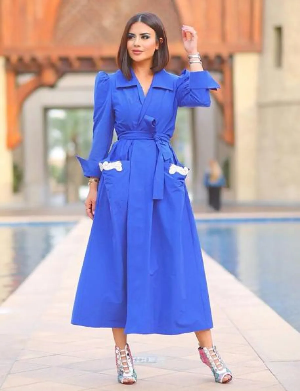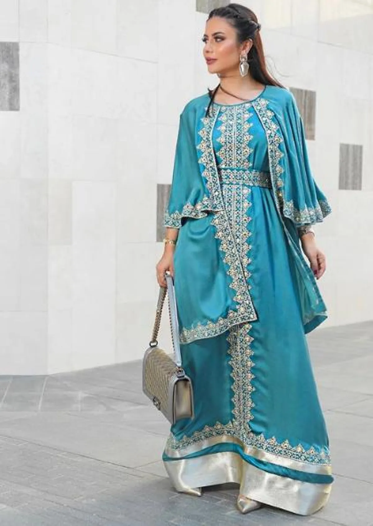لأحد المشاوير المسائية، اختارت ديما الاسدي قفطانًا بتصميم فاخر باللون الأزرق الغني، مطرزًا بخيوط باللون الفضي على شكل زخرفات شرقية، وقد نسقت معه شنطة يد باللون الفضي الميتالك من “شانيل” Chanel، وحذاءً بكعب عالٍ باللون الفضي أيضًا، وأكملت الاطلالة بأقراط كبيرة.