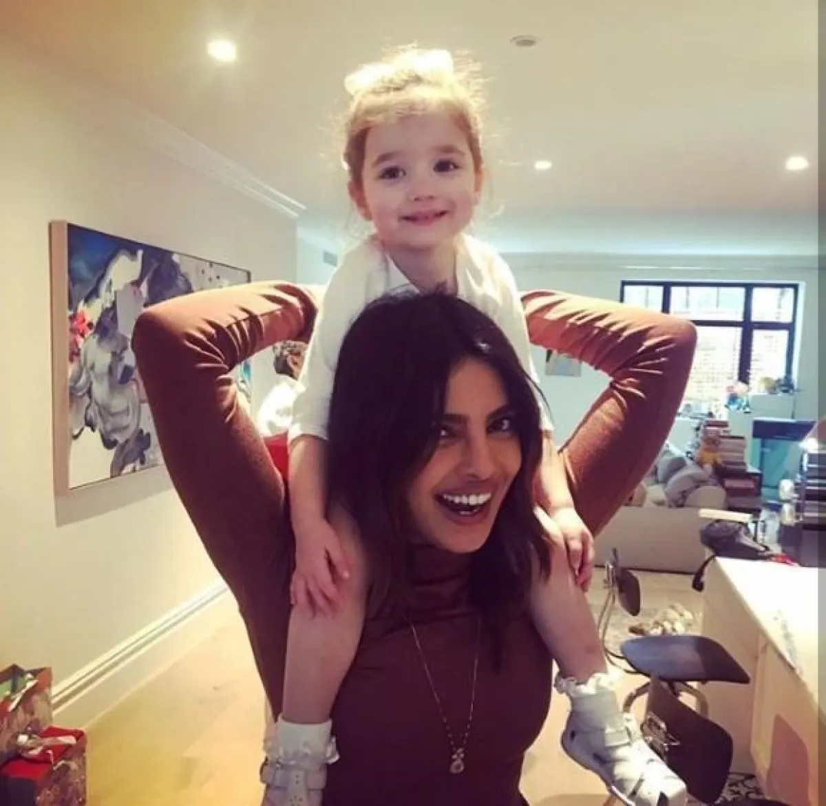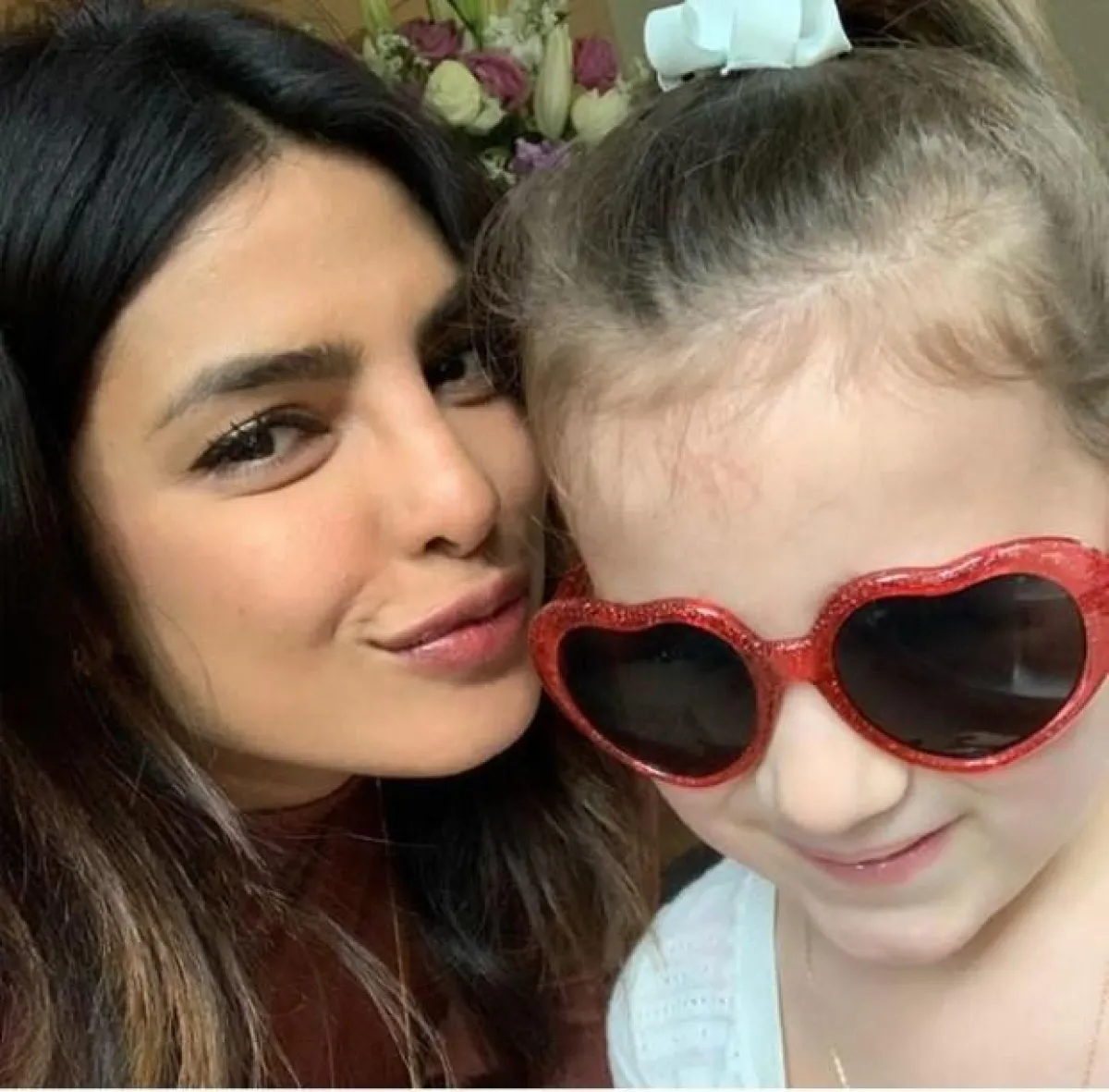 وفي صورة أخرى تظهر بريانكا مع طفلة أحد أقرباء زوجها نيك وهي تحملها، وعلقت على الصورة بالقول: "عيد الأمهات..أفتقدكِ مادهوري شوبرا."