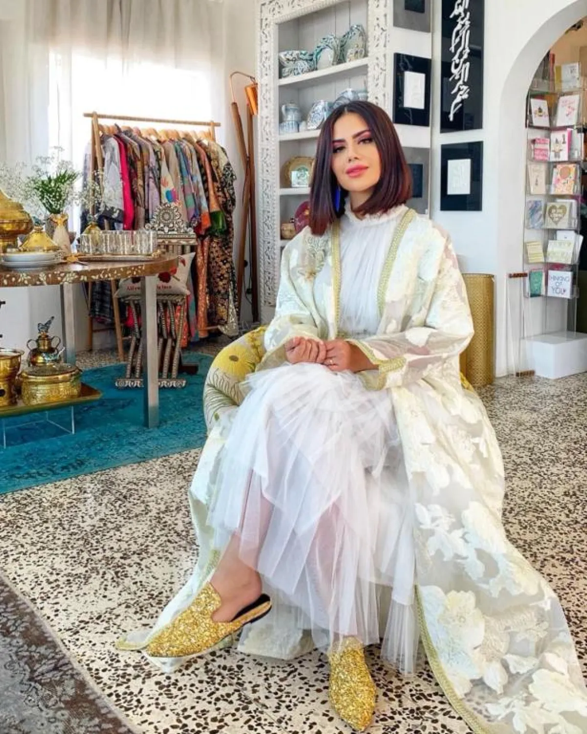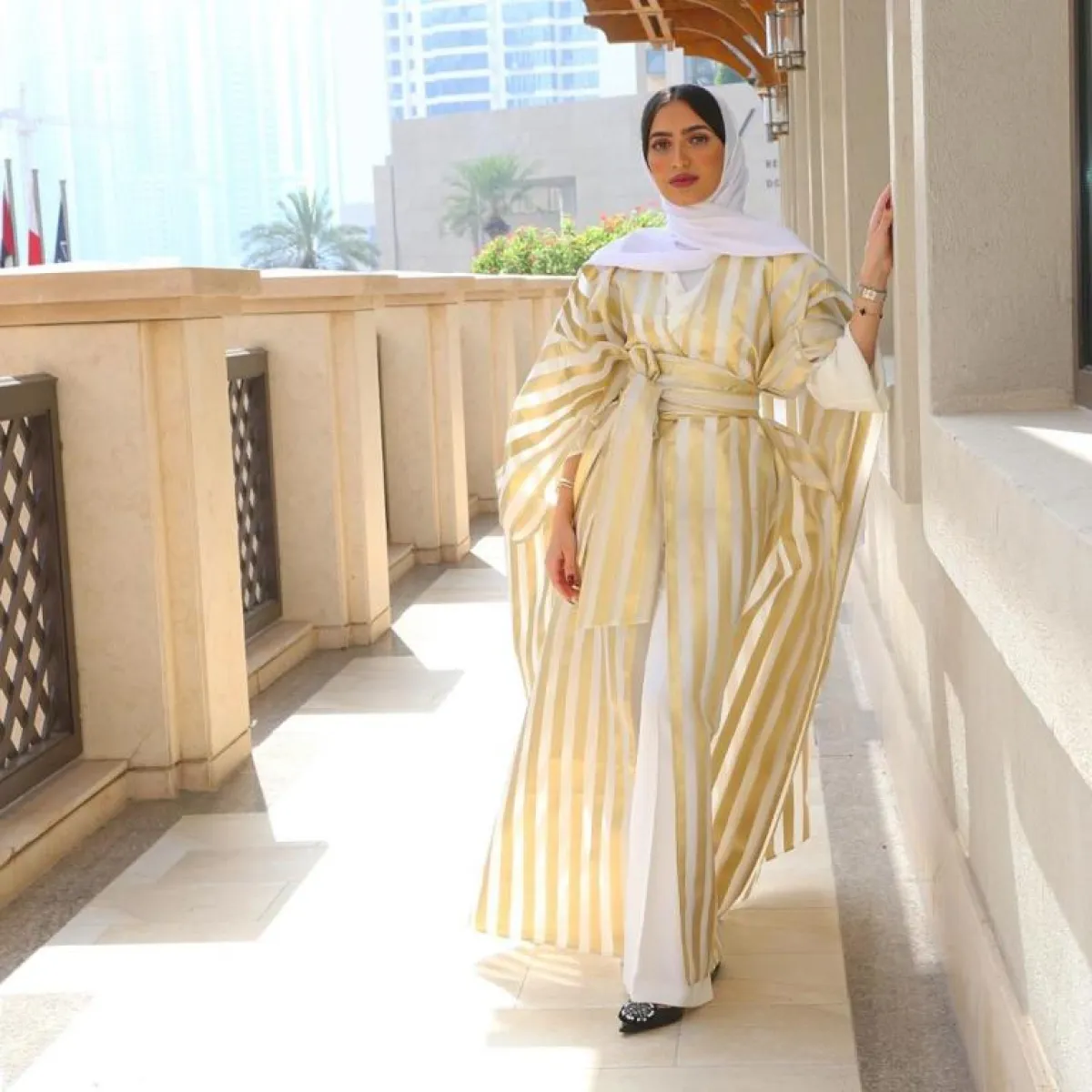 أما المدونة العراقية ديما الأسدي، فقد أطلت بـ عباءة مفتوحة نسقتها مع فستان من طبقات التول، كما انتعلت حذاء "المول" من حبيبات الغليتر الذهبي، لتضيف لمسة مرتبطة بشهر رمضان. كذلك، ذهبت ديما إلى فستان مستوحًى من العباءة العربية لكن بتصميم عصري، كما أنّ لونه الأحمر الصريح أضاف لاطلالتها حيويةً وبهجة.