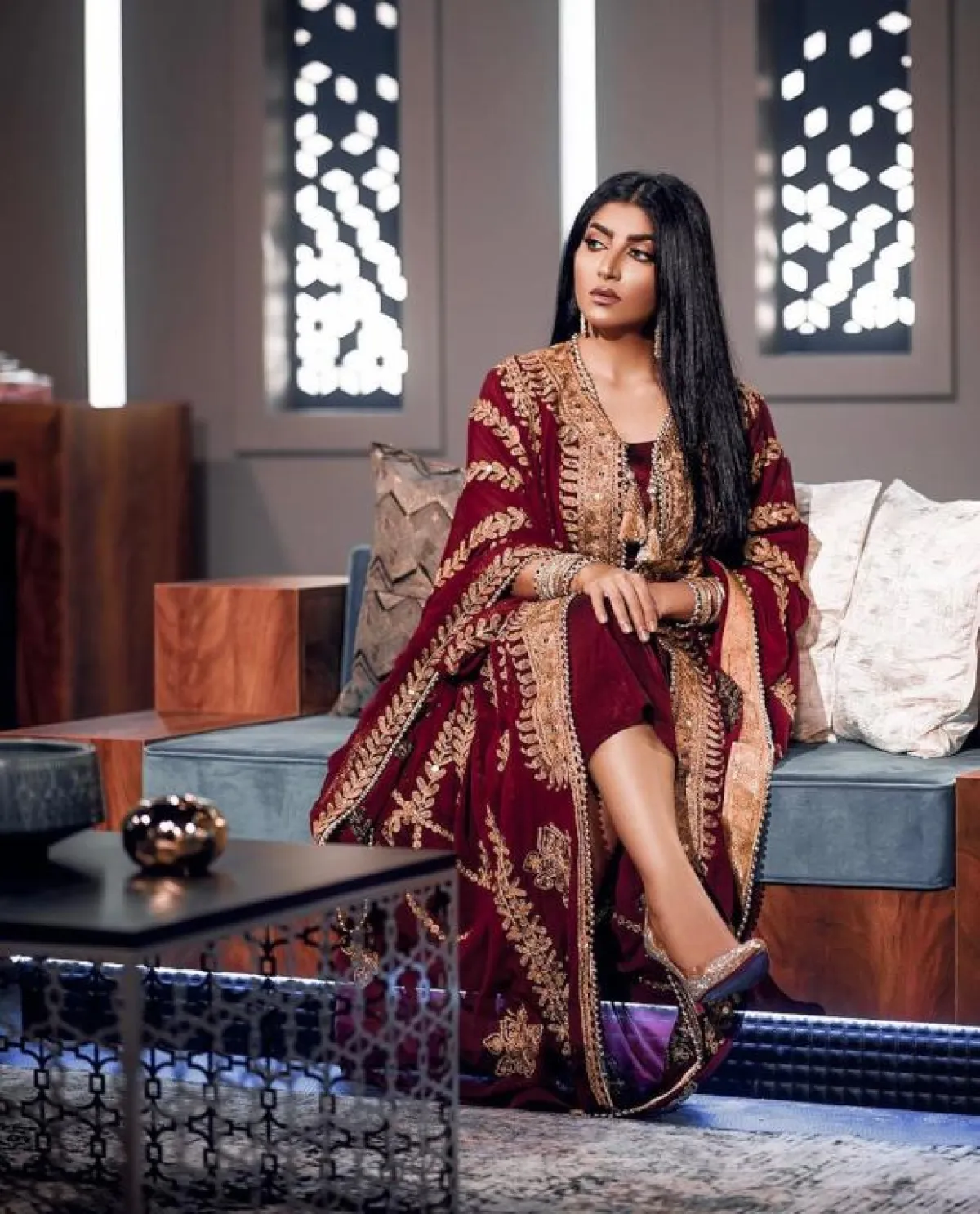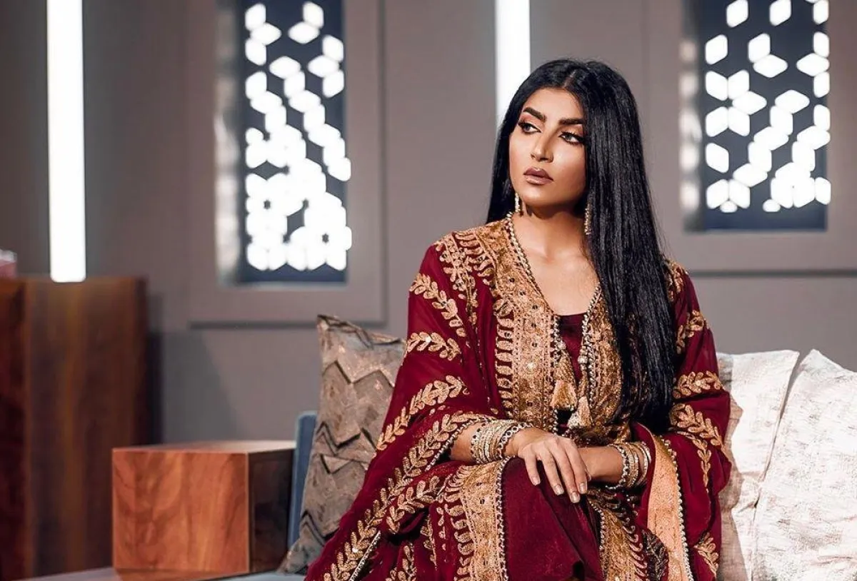 نبدأ بالممثلة العُمانية بثينة الرئيسي، التي أطلت في أحد البرامج التلفزيونية في اليوم الأول من رمضان، باطلالة تحمل الطابع الخليجي، حيث ارتدت عباية بالتوتي الداكن، ومزينة بالكامل بالخطوط والتطريز الذهبي.