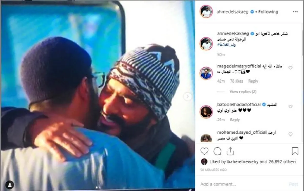 السقا نشر صورة جمعته بتامر حسني من كواليس تصوير المسلسل وعلق عليها قائلا: شكر خاص لأخويا أبو الرجولة تامر حسني" ليرد الأخير عليه قائلا: حبيبي يا أحمد أنت صاحب عمر وأبو الرجولة والجدعنة وانشاء الله هتكسر الدنيا زي كل أعمالك، عمنا محمود شلبي بسلم عليك.