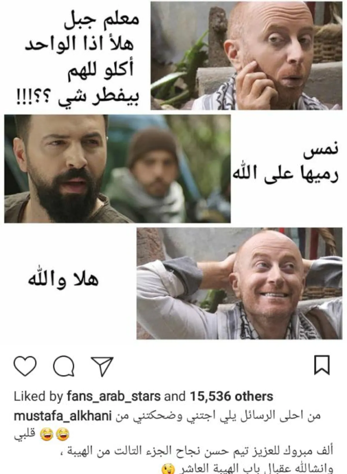 ونشر مصطفى الخاني صورًا وحوارًا من ابتكار أحد متابعيه، يضم مفردات اشتُهر بها النمس، "وهي الشخصية التي جسدها في مسلسل "باب الحارة"، وبين المفردات التي يستخدمها تيم حسن من خلال "جبل شيخ الجبل" التي يجسدها في مسلسل "الهيبة"، كما علق بطريقة طريفة على نجاح الجزء الثالث من المسلسل، متمنّيًا إنجاز 10 أجزاء منه، على طريقة مسلسل "باب الحارة".