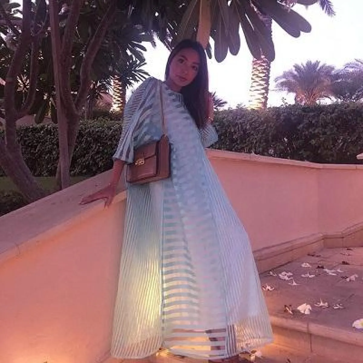 - انتقت العنود بدر، الفاشنيستا ومصممة الأزياء السعودية، صاحبة العلامة التجارية «ليدي فوزازا»، جلابية باللون الكحلي وطبعات الورود الناعمة، وقد نسّقتها مع حقيبة خصر بيضاء صغيرة، مضفيةً عليها لمسة عصرية بامتياز.