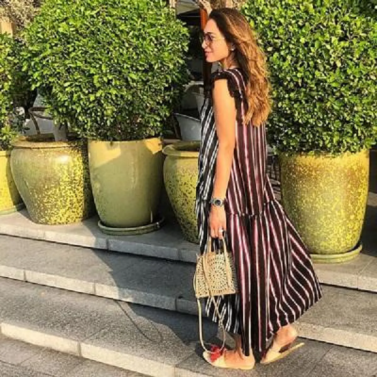 - أما المدونة السعوديّة دانا ملحس غندور، فقد اختارت لشهر رمضان هذا العام إطلالة نهارية مريحة؛ من خلال اعتمادها على جلابية بالتقليمات السوداء، الحمراء، والبيضاء. وقد نسّقتها مع حقيبة يد صغيرة باللون البيج، بتصميم sac de jour.