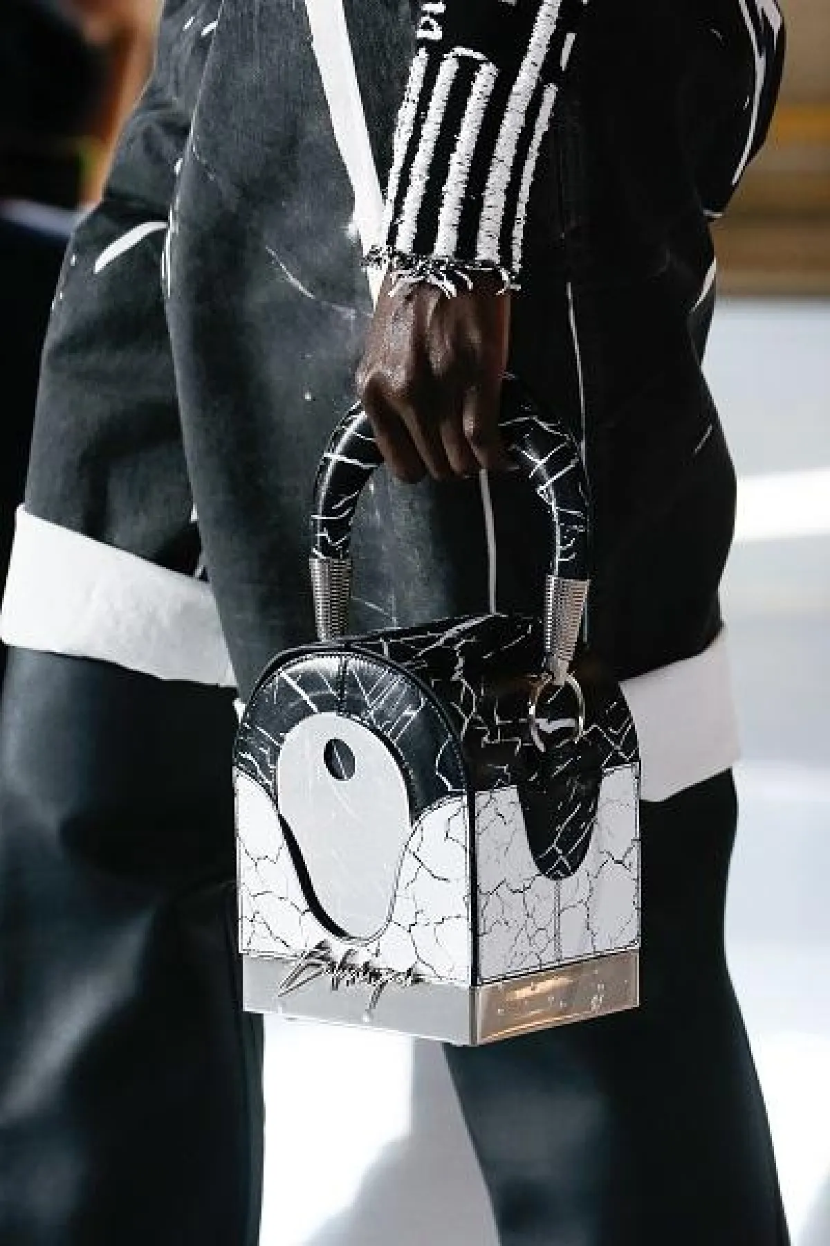 كذلك لفتتنا حقيبة اليد ذات التصميم الهندسي باللونين الأسود والأبيض الرخاميين من علامة «بالمان» Balmain.