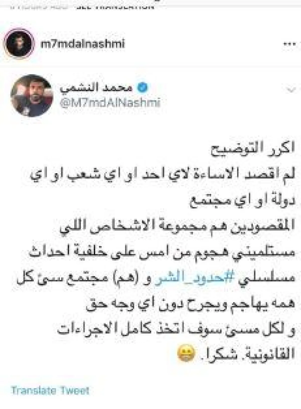 وأضاف النشمي " قررت الرد بعد حملة الهجوم الكبيرة التي تعرضت لها على موقع التواصل الاجتماعي تويتر لذلك أردت أن أوضح أن انتقادي للمهاجمين من أصحاب الفكر الرجعي الذين يهاجمون عملاً فنياً دون أن يكلفوا أنفسهم عناء متابعته ولم أقصد أي جنسية أو دولة في ردودي على المهاجمين في تويتر. ولم أقصد الإساءة لأي أحد سواء في تويتر أو المسلسل".