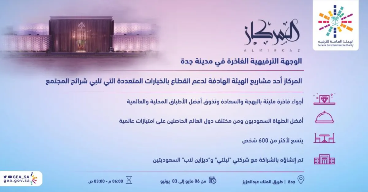 شهد "المركاز" -الوجهة الترفيهية الفاخرة في مدينة جدة– والذي أقامته الهيئة العامة للترفيه اقبالاً متزايداً منذ إطلاقه مطلع شهر رمضان الجاري، ويشكل المركاز الذي يتبني مفهوم الخيمة الرمضانية تعريفاً دقيقاً لتطبيق أحدث المعايير العصرية ويتسع لأكثر من 600 شخص، كما يعد أحد مشاريع الهيئة الهادفة لدعم القطاع بالوجهات الترفيهية النوعية والخيارات المتعددة التي تلبي تطلعات شرائح المجتمع بما يحقق إثراء الحياة ونشر البهجة.