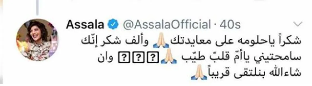 أصالة تجاوبت مع تغريدة أحلام، وأكدت لها أنها سامحتها ووصفتها بصاحبة القلب الطيب، كما تمنت أن يحصل لقاء بينهما لقاءً قريباً.