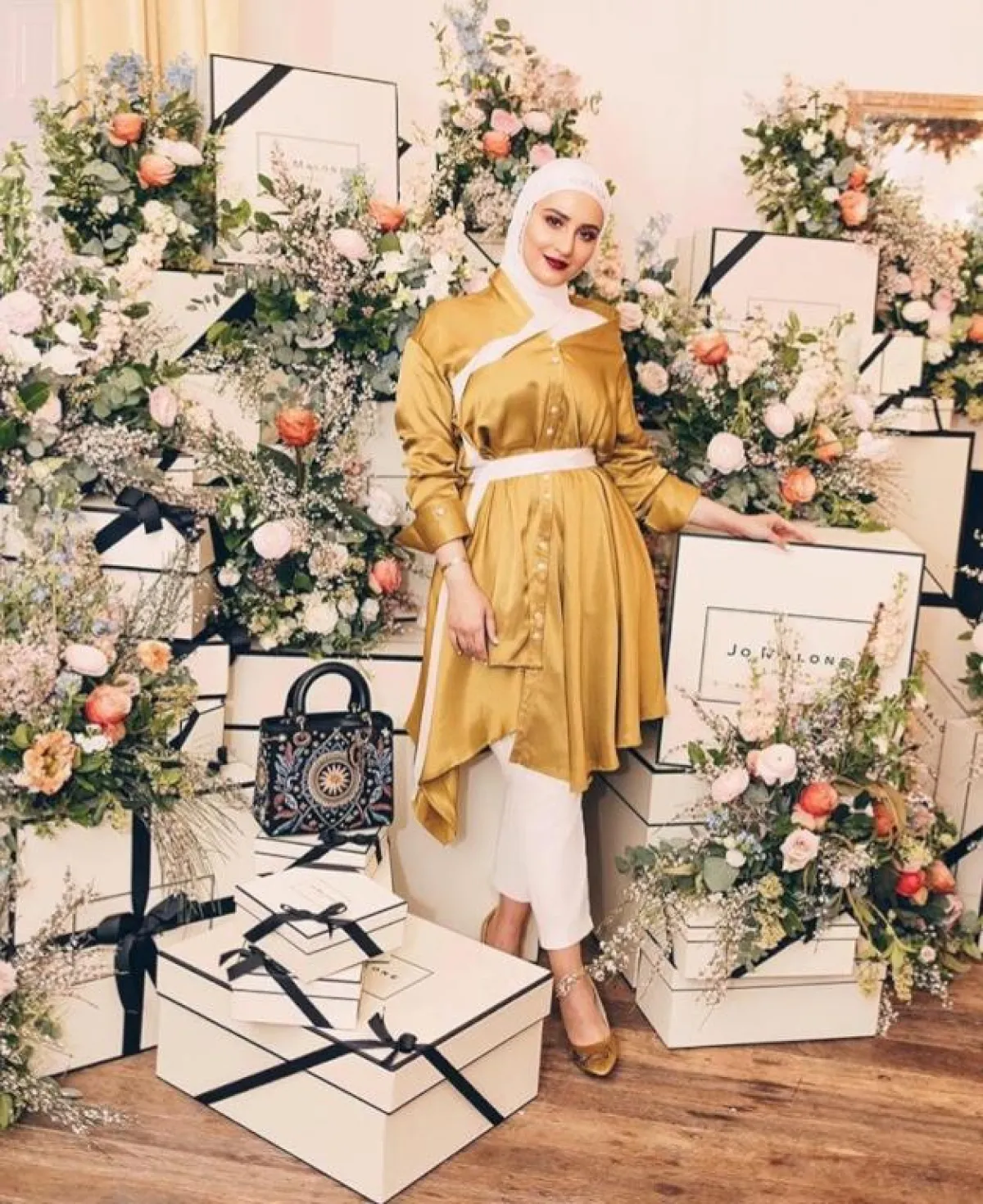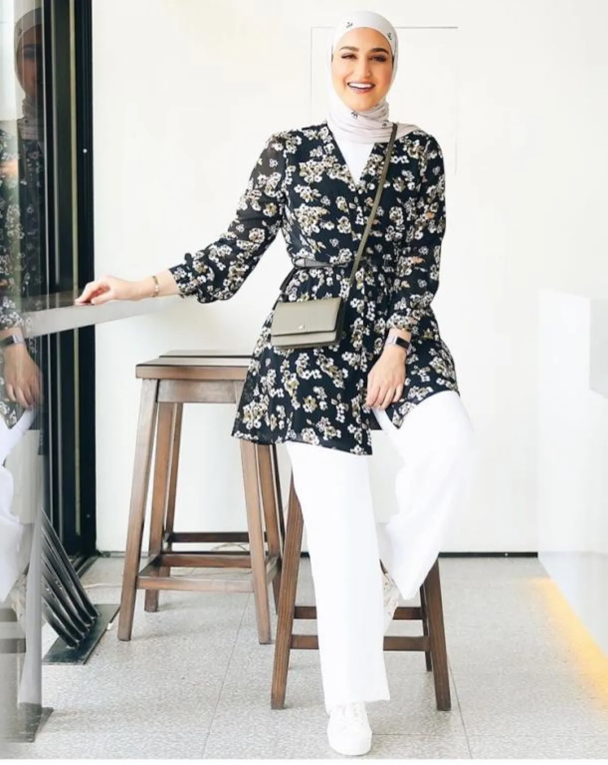 بتصميم بسيط وهادئ من مجموعة مايكل كورس Michael Kors للشرق الأوسط، اختارت دلال الدوب البليزر الأسود المطبع بالورود، مع بنطلون أبيض لاطلالة عملية مناسبة للمحجبات خلال النهار، مع الشنطة الكروس، كما أنها مناسبة لكِ أثناء الذهاب للعمل، مع استبدال الشنطة بواحدة أكبر.