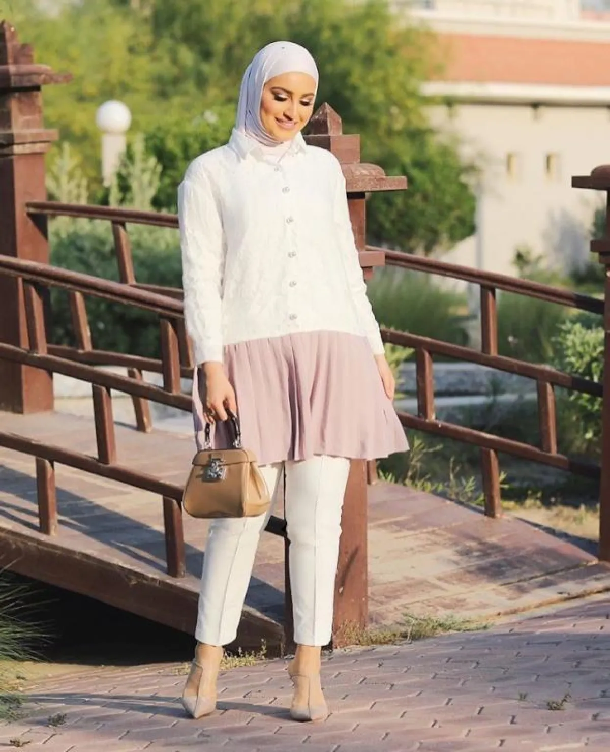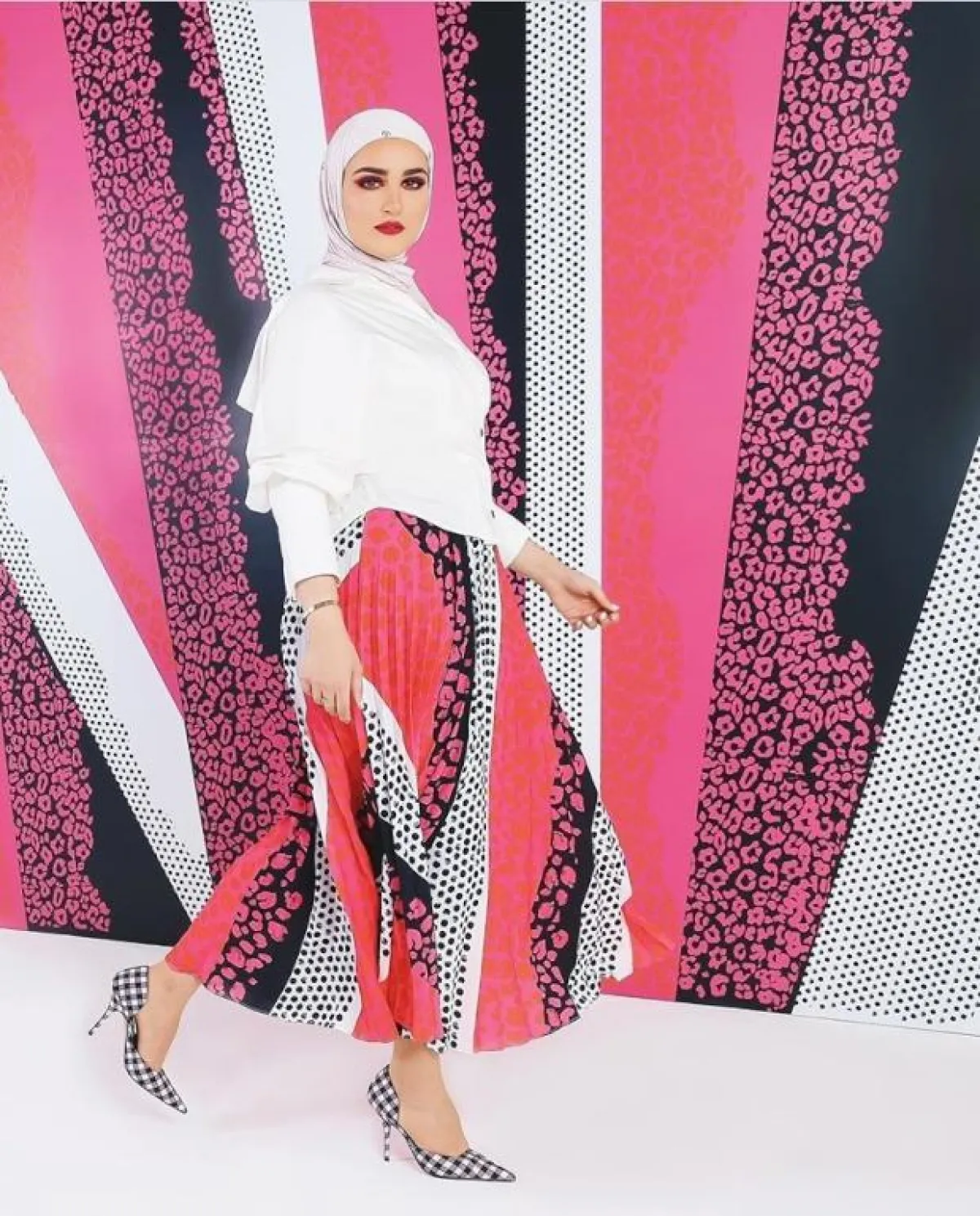 هذا التنسيق أصبح رائجًا بشكل كبير بين مدونات الموضة، وطبّقته دلال الدوب بطريقة خاطفة للأنظار، باعتماد التنورة البليسه بألوان الفوشي الفاقع، مع بلوزة بيضاء بسيطة، لاطلالة كلاسيكية لا تخلو من اللمسة العصرية.