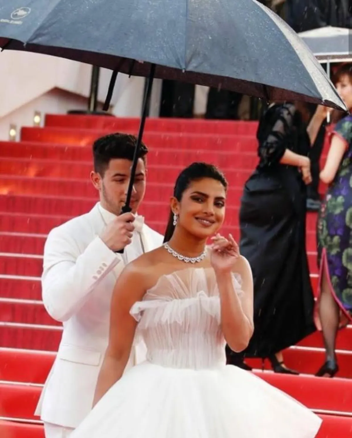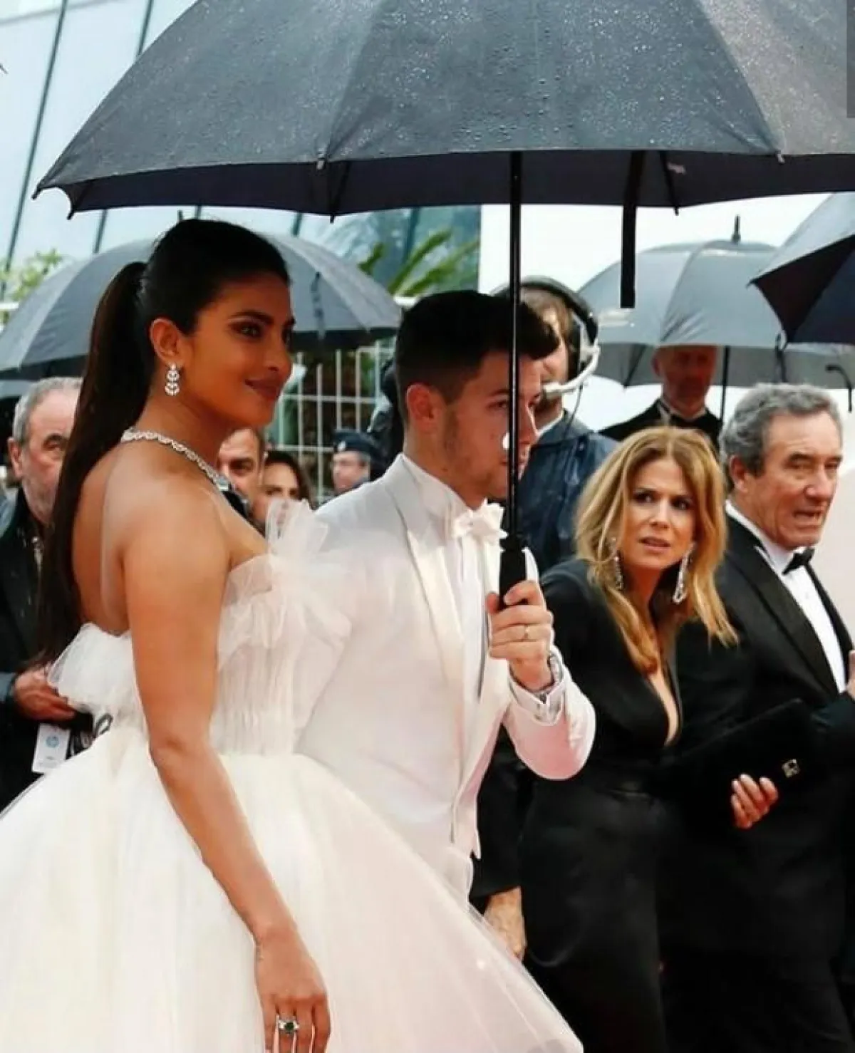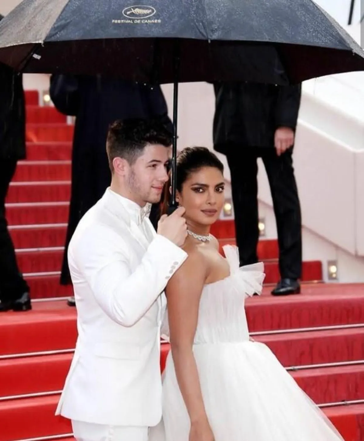 بدوره بقي النجم نيك جوناس Nick Jonas زوج بريانكا مرافقها على السجادة الحمراء وهو حامل في يده المظلة، متألقاً ببدلة رجالية من اللون الأبيض أيضاً.