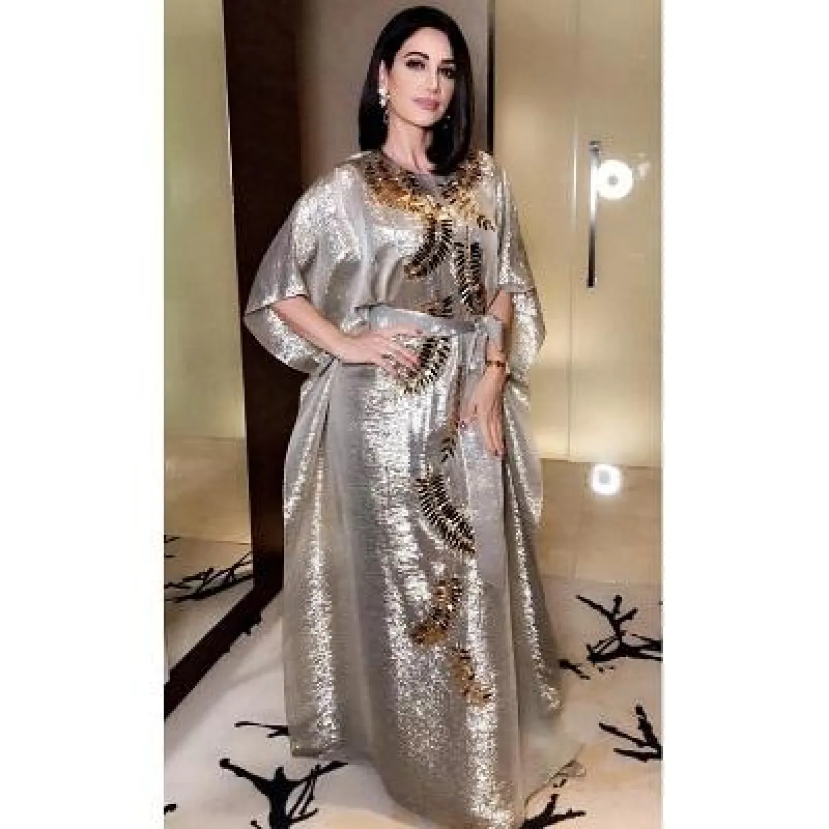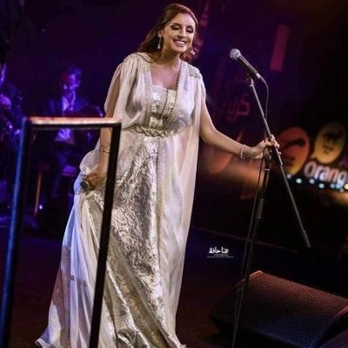 - واختارت المطربة أنغام تصميمًا راقيًا باللون الأبيض، ومطرّزًا بالخيط الذهبي الفاخر. يتميّز هذا القفطان بأكمام شبه مكشوفة، وحزام حول الخصر؛ لإطلالة مفعمة بالأنوثة.