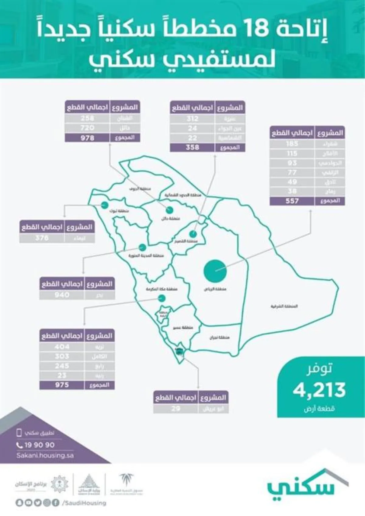وتضمنت المخططات الجديدة 6 مخططات بمنطقة الرياض توفر أكثر من 550 قطعة أرض، و4 مخططات بمنطقة مكة المكرمة توفر 970 قطعة أرض، و3 مخططات جديدة بمنطقة القصيم توفر 400 قطعة أرض، إضافة إلى خمسة مخططات أخرى جديدة توفر حوالي 2400 قطعة أرض موزعة بين عدد من المناطق والمحافظات.