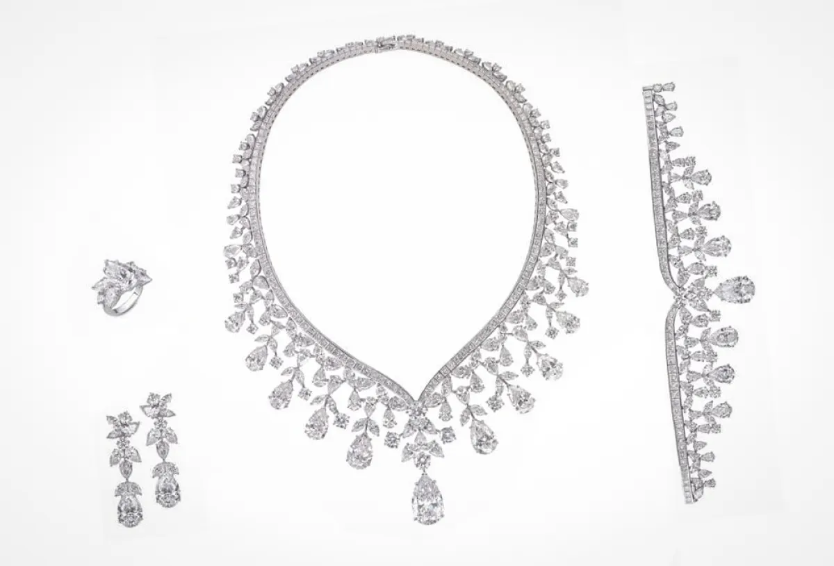 يذكّرنا طقم الألماس "ماجستيك" بقصص الحبّ الأسطورية التي لا يقوى عليها الزمن، فهو يشعّ بريقاً خلّاباً لأنه يحتوي على بعضٍ من أروع أحجار الألماس الطبيعي من عيار D-H بوزن لا يقلّ عن 274.05 قيراط. وقد رُصّع العقد بمجموعة من أحجار الألماس المتعدّدة الأشكال التي تتداخل في ذهبٍ أبيض عيار 18 قيراطاً، لتلفت النظر بسهولة إلى حجر الألماس المذهل بشكل الكمثرى عيار 15.23 قيراطاً من عيار D-FL.