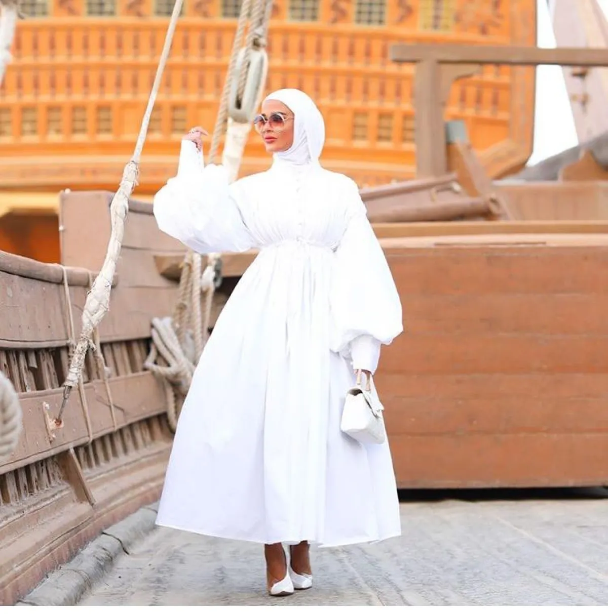الأبيض أصبح أسلوبًا عصريًّا تعبّر به المدونات عن أناقتهنّ، لا سيّما بالعبايات، مناسِبة للشهر الكريم وللصيف كذلك، كالعباية الفستان باللون الأبيض التي اعتمدتها مدونة الموضة مرمر محمد بستايل منفوش قليلًا مع حزام الخصر.