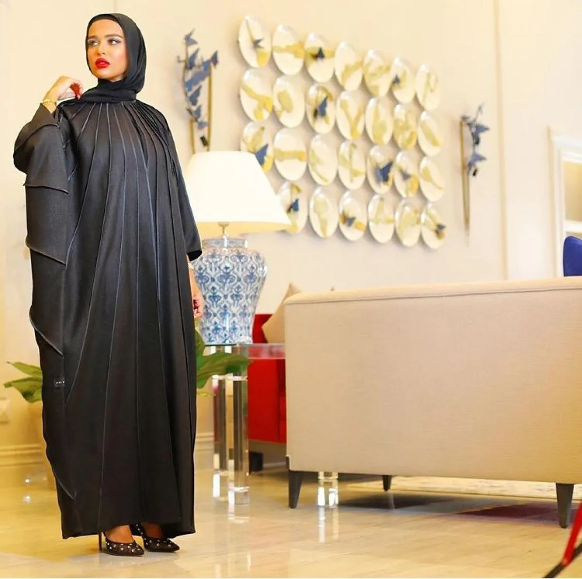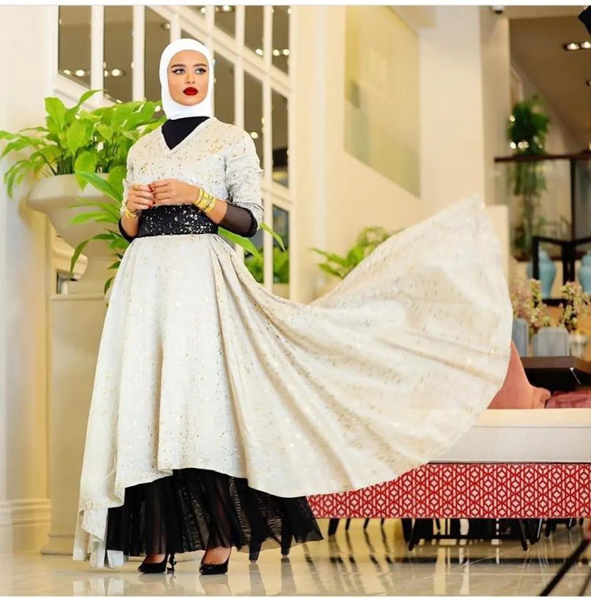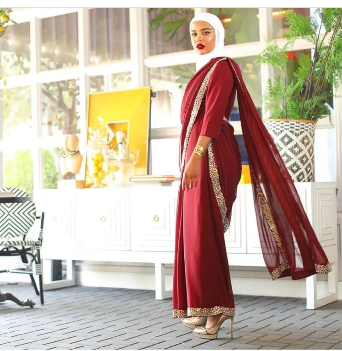للمسة مختلفة، لِمَ لا تتألقين بإحدى ليالي رمضان بعباية تحمل أسلوب وثقافات بلاد أخرى، مثل الساري الهندي الذي اعتمدته مرمر محمد بالعباية باللون الأحمر، ولتكتمل اللمسة المترفة، اختارت كعبًا عاليًا باللون الذهبي، لكنها أبقت لون الحجاب الأبيض المعتاد لديها.