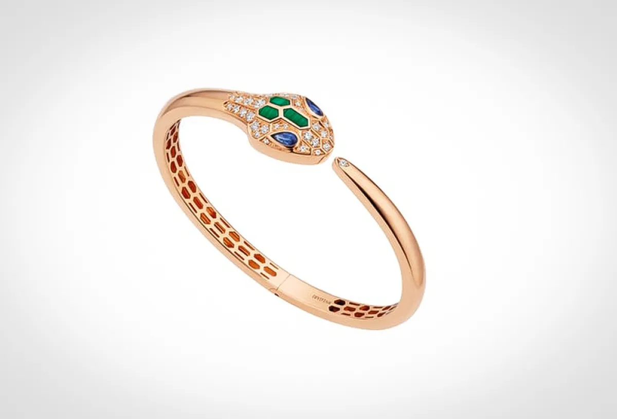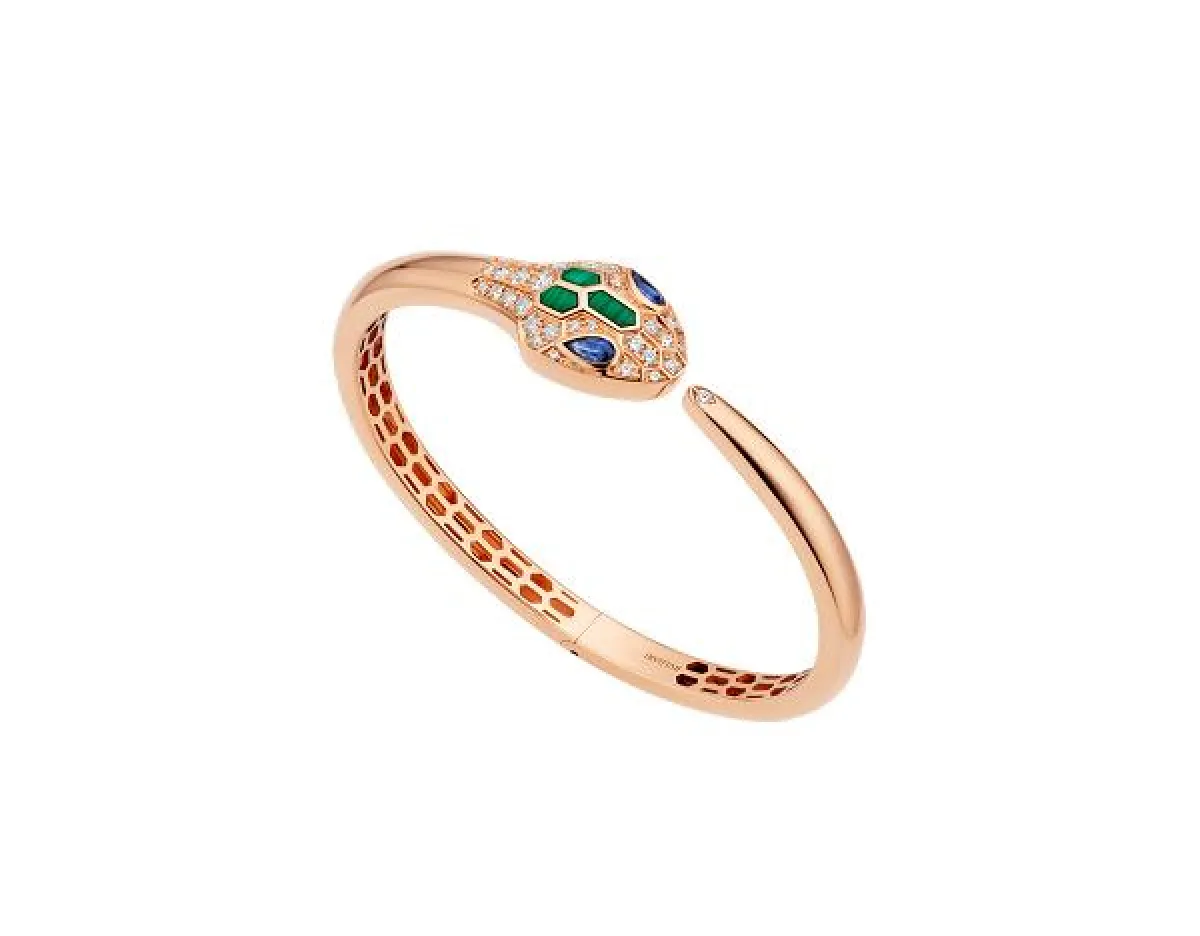 من دار بولغاري Bvlgari انتقينا سوار ذهب من مجموعة Serpenti الفاخرة المستوحاة من الأفعى كهدية رائعة لعيد الفطر. هذا السوار يجسّد القوّة والفخامة بتصميمه الأنيق من الذهب الوردي والمرصّع بالياقوت الأزرق والملكيت الأخضر والماس.