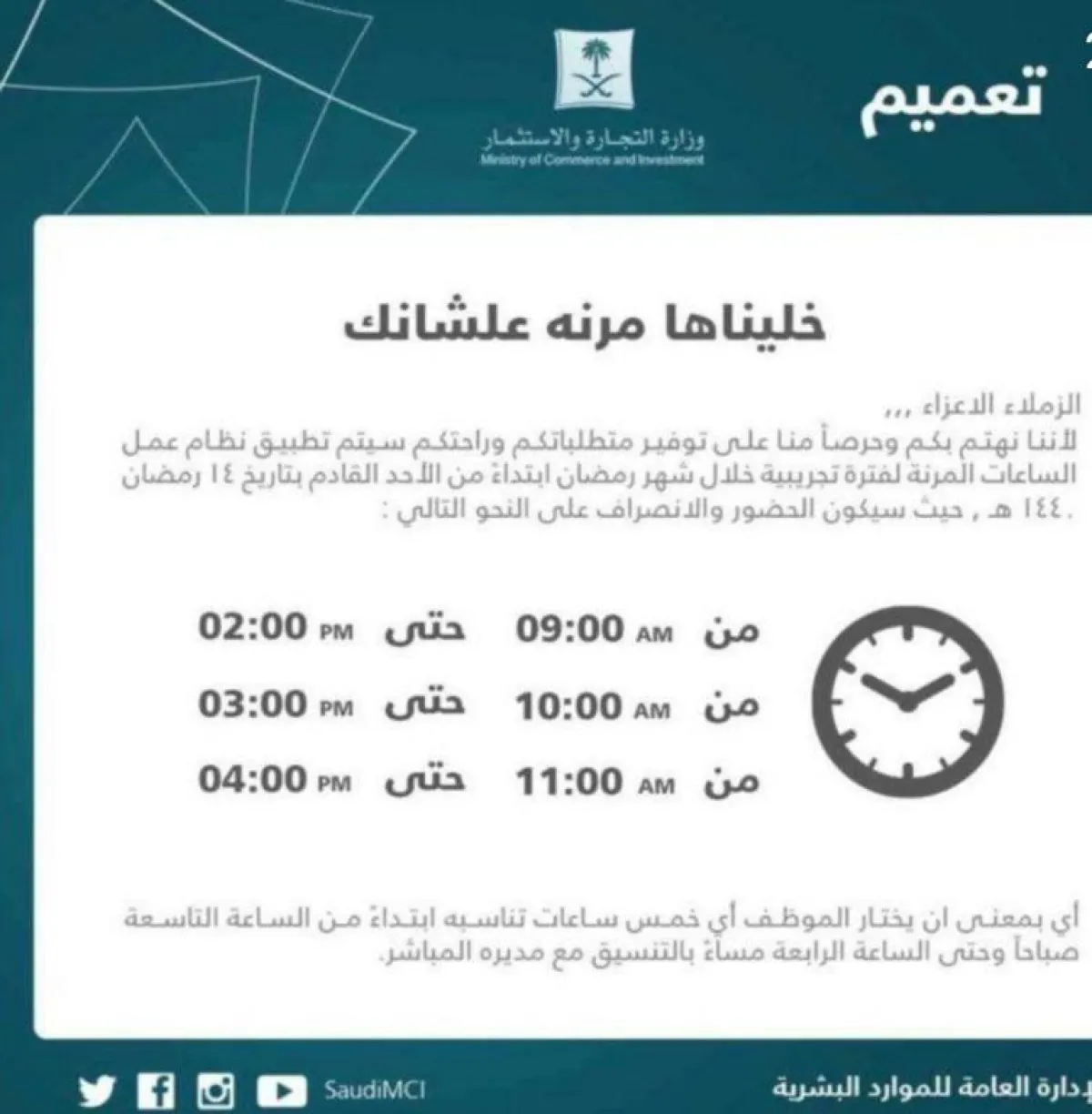 وقال مصدر في الوزارة، بحسب صحيفة "الوطن"، إن وزارة التجارة والاستثمار أطلقت نظام الدوام المرن كمرحلة تجريبية لقياس قبوله بين الموظفين ومناسبته لعمل، ولو تم تطبيقه بعد شهر رمضان المبارك سيكون بساعات عمل مختلفة محددة بسبع ساعات للفترة الصباحية، وست ساعات للفترة المسائية.