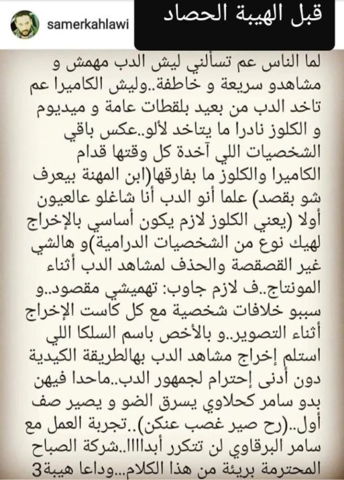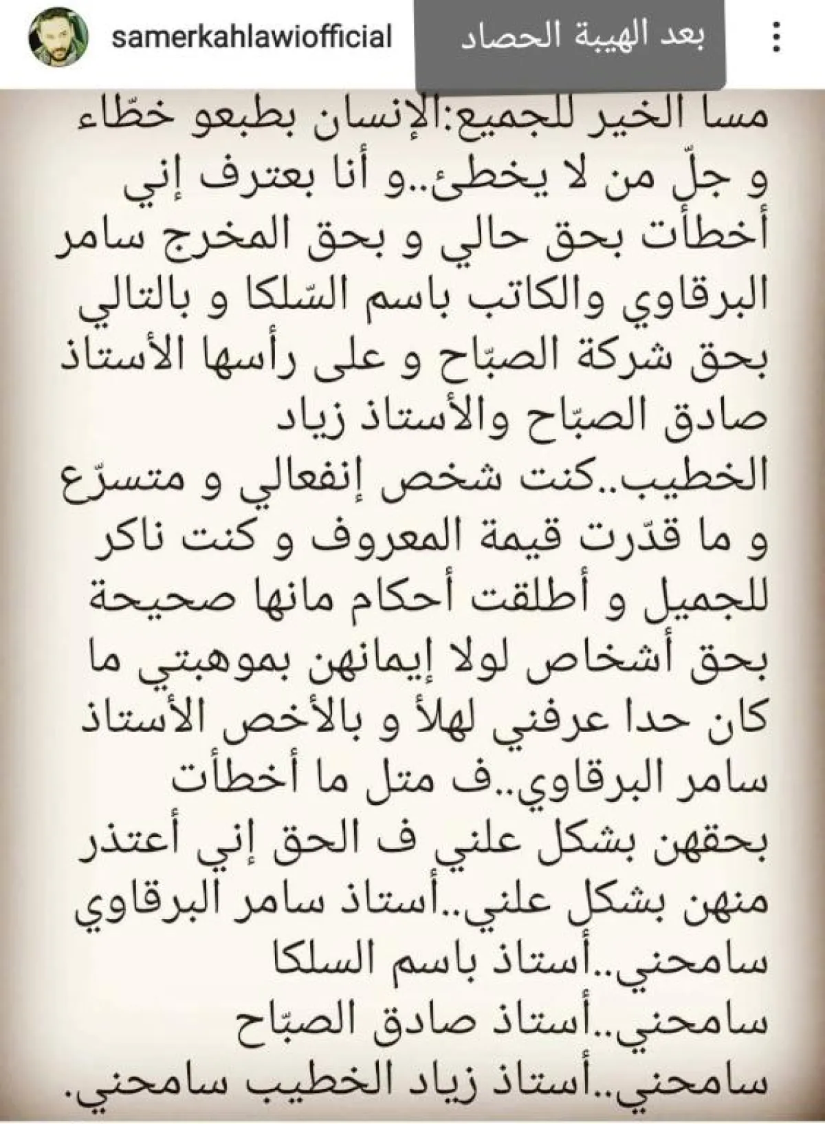 وأوضح الممثل سامرالكحلاوي، أنه لم يقدّر قيمة المعروف وكان ناكراً للجميل وأطلق أحكاماً غير صحيحة في حق أشخاص آمنوا بموهبته، وأنه لولاهم لما كان أحد عرفه، وتحديداً المخرج سامر البرقاوي، وطلب السماح منه ومن الكاتب بسام السلكا والمنتج صادق الصباح وزياد الخطيب.