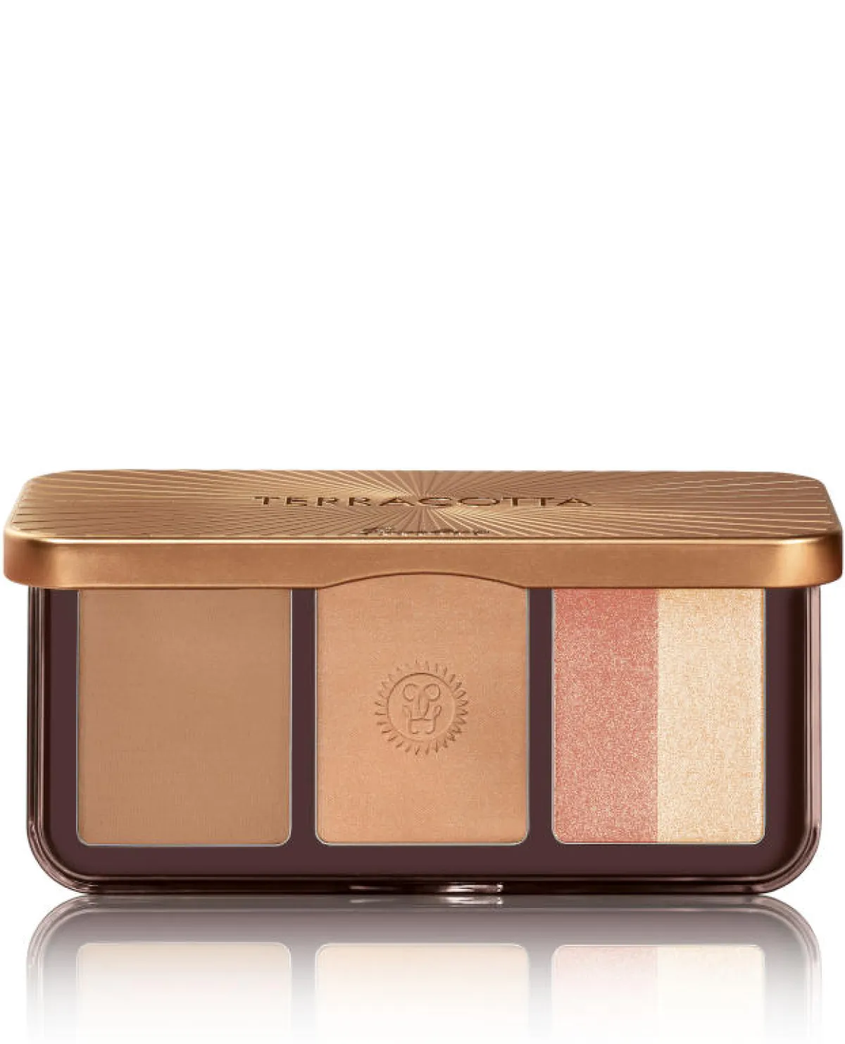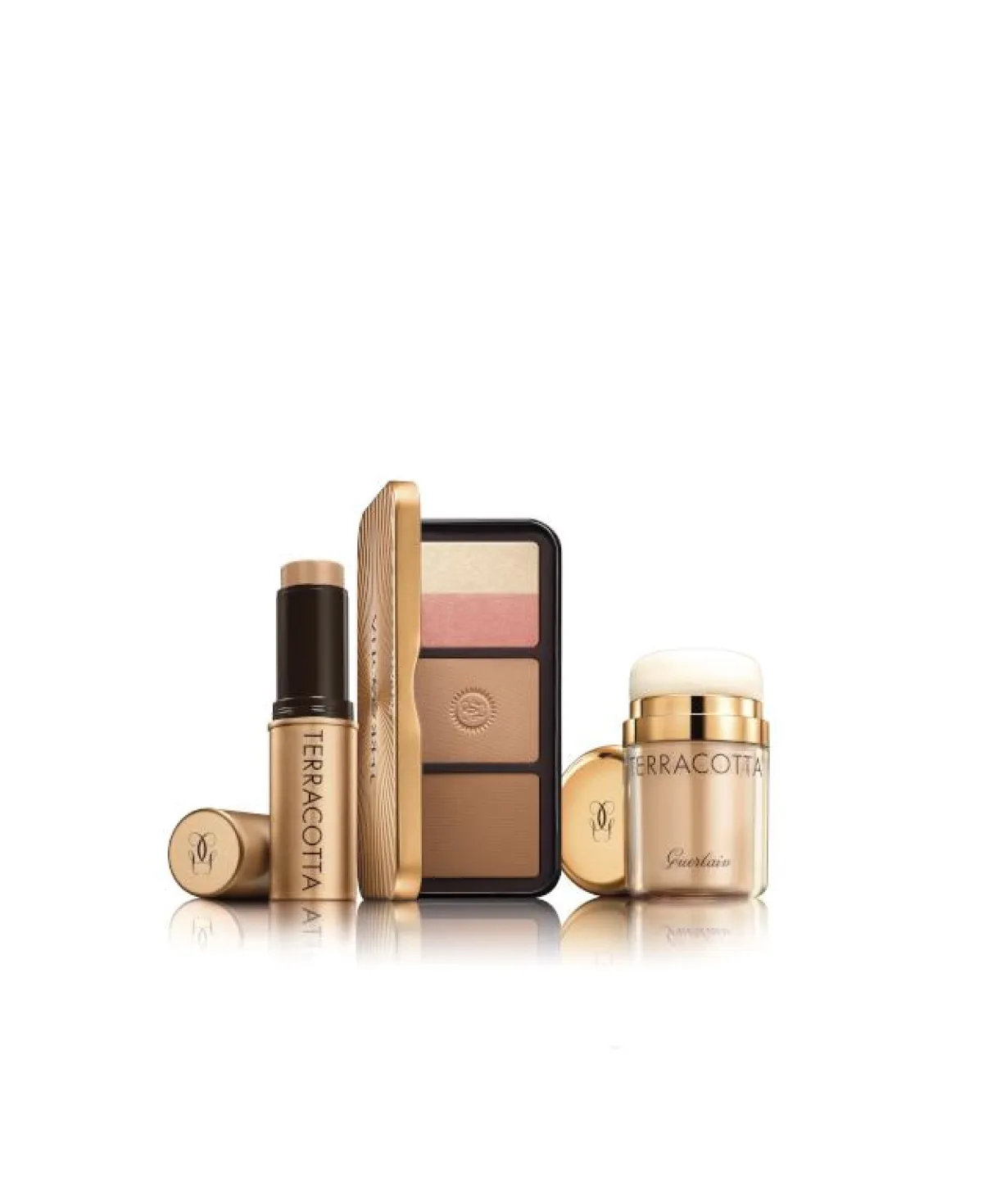 أنبوب مستحضر أساس يتّحد مع البشرة، وآخر لإبراز الملامح بتأثير strobing* قابل للتعديل، وبودرة رقيقة للتحكّم باللمعية بلمح البصر، ولوحة ألوان تحتوي على أسلوب كامل... يسهل استعمال المستحضرات حتّى من دون مرآة، وتمنح لمسة نهائيّة غير ملحوظة. تندمج المستحضرات لتأمين أسلوب ماكياج كامل لإشراق جميل ذهبي مشبّع بالشمس طوال العام، وتكون جميعها معطّرة بإرهاف بعطور مشمسة غنيّة برائحة الأزهار من "تيراكوتا" Terracotta.
