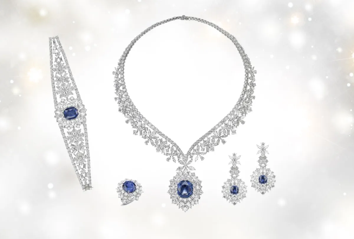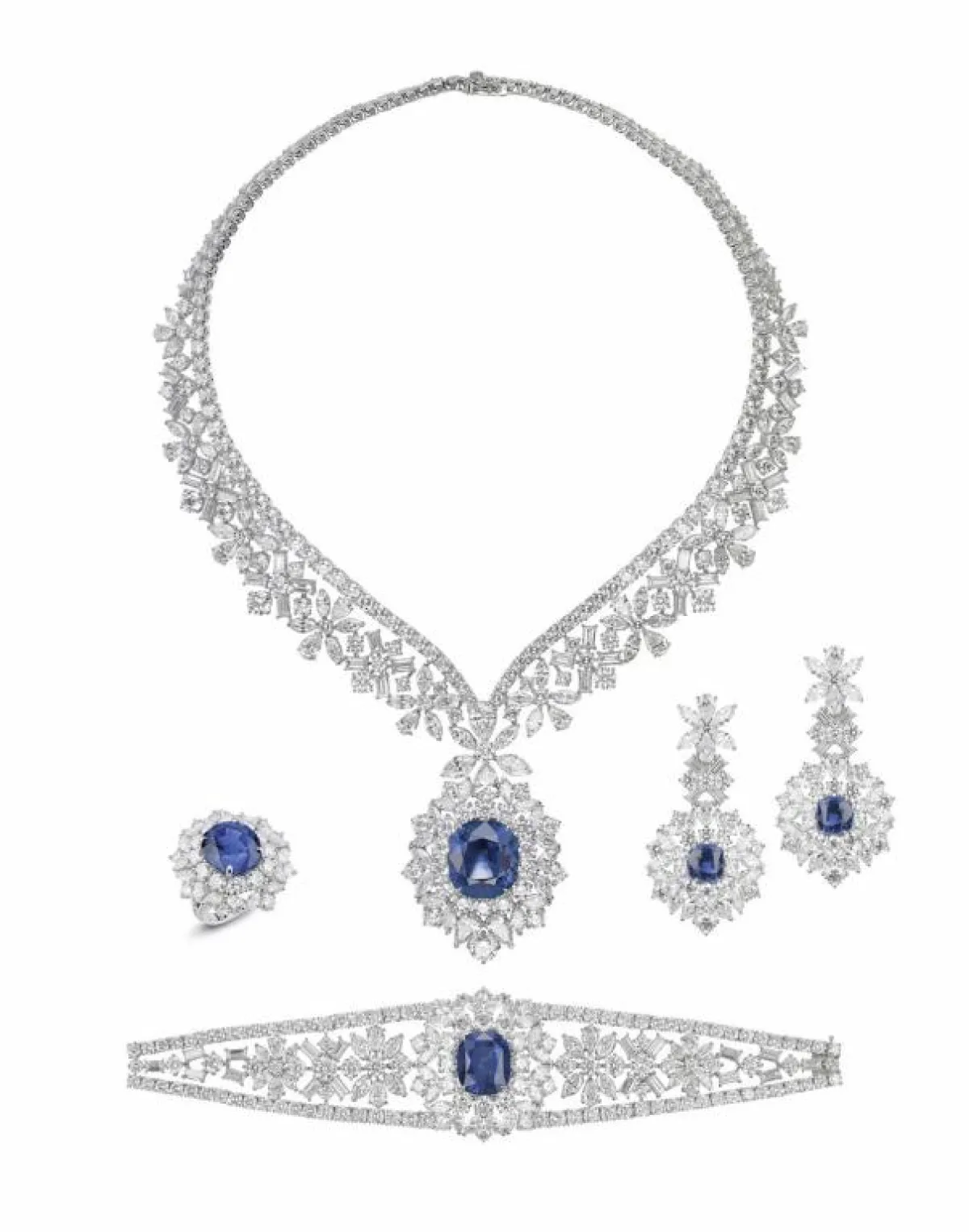 وتميّزت أيضاً عملية التصميم بسمتَين أساسيّتَين ألا وهما الوقار والانسجام. فقد ولّد الياقوت الأزرق برصفه البارع، الذي ينفح الحياة في خلفية برّاقة من الألماس الأبيض الناصع، لوناً ملفتاً للبصر وبصيصاً قوياً من الضوء. فكانت النتيجة تحفةً فنية فريدة ومذهلة للغاية لا تقدر إلّا دار معوّض على تنفيذها