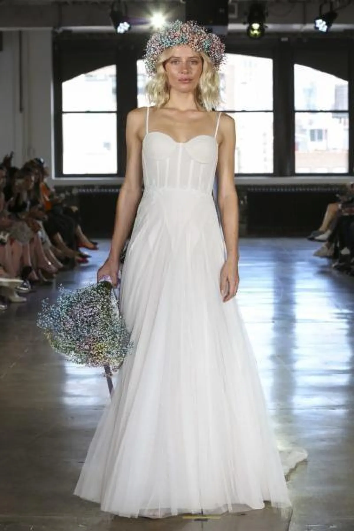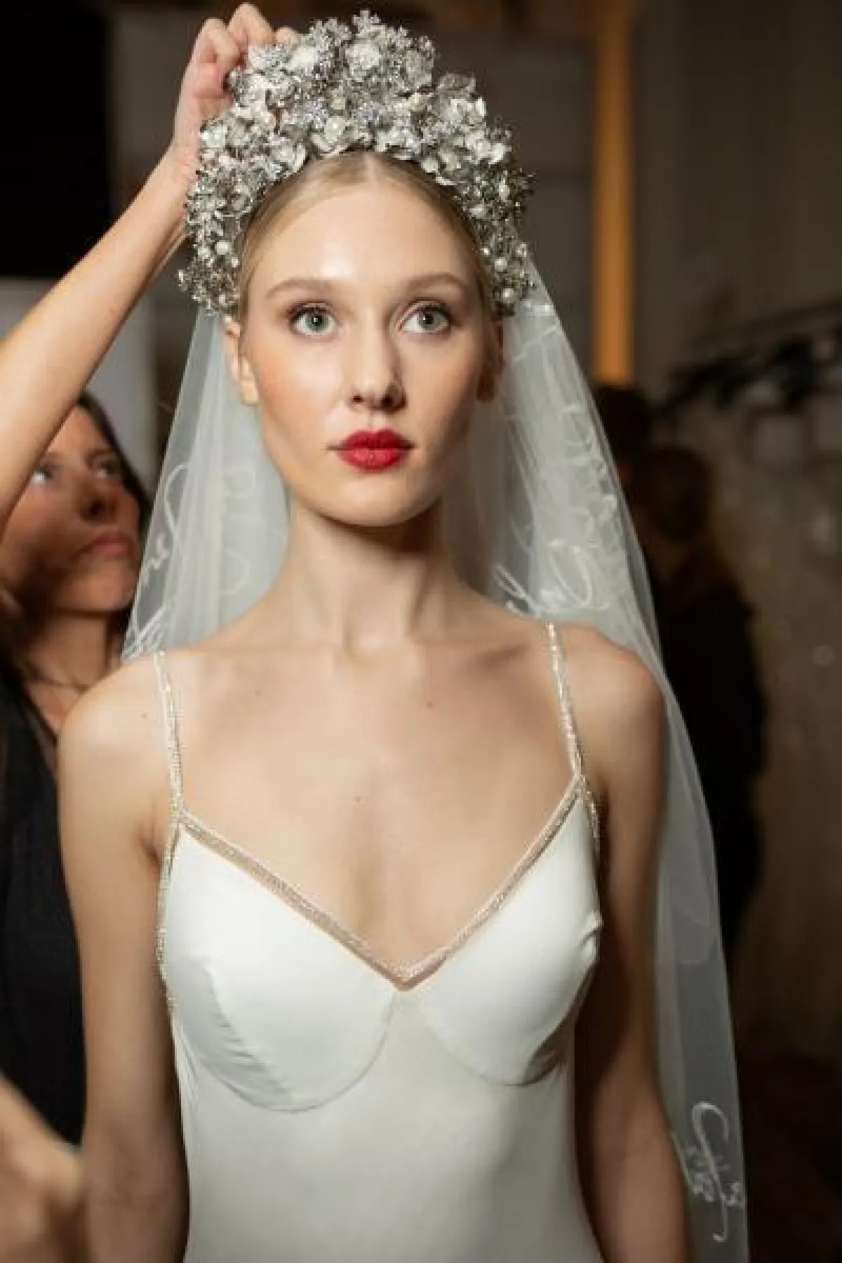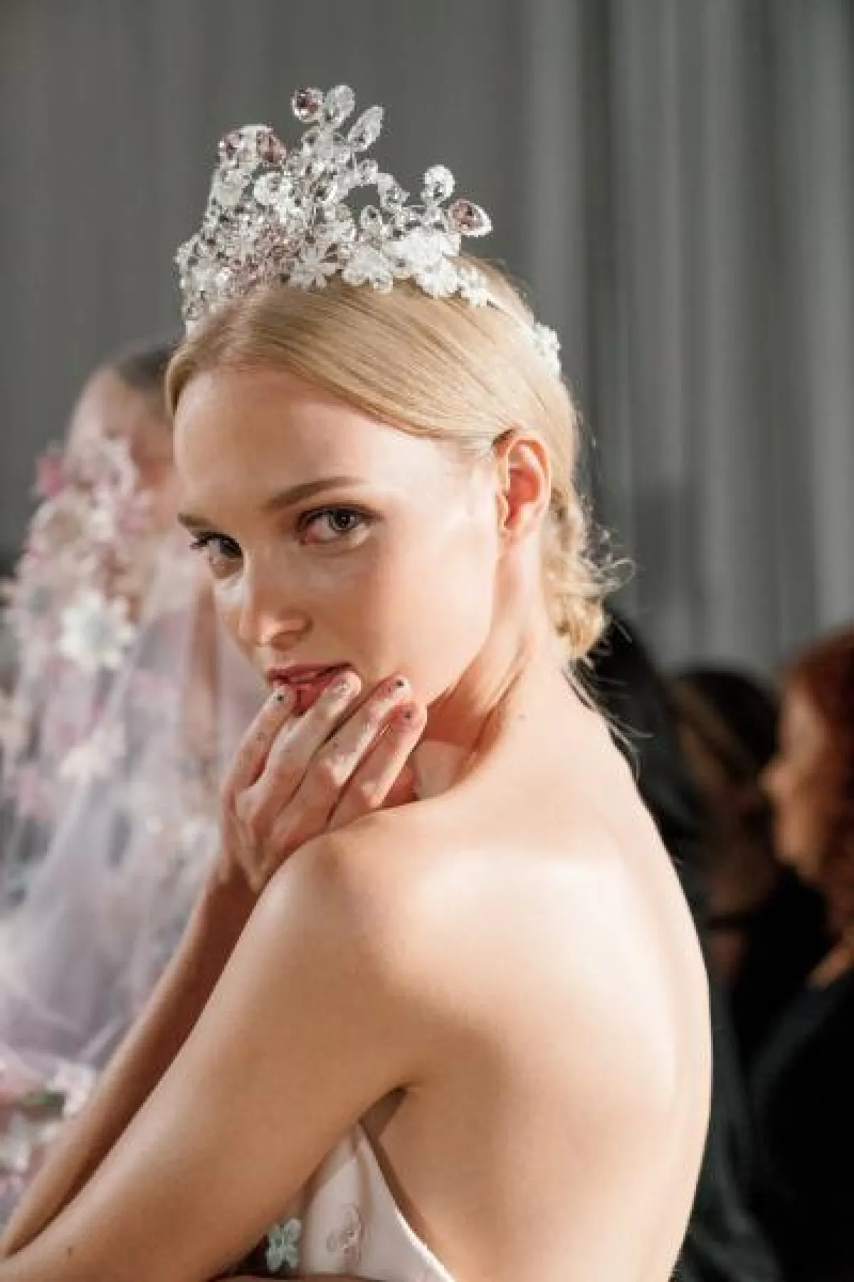 وتنوعت تيجان وأطواق العروس لترضي مختلف الأذواق، سيطرت عليها التيجان المرصعة بالفصوص البرّاقة، مثل تيجان ريم عكرا Reem Acra، آن بيرغ Anne Barge، بيرتا Berta، Hayley Paige، ورومونا كيفيزا Romona Keveza.