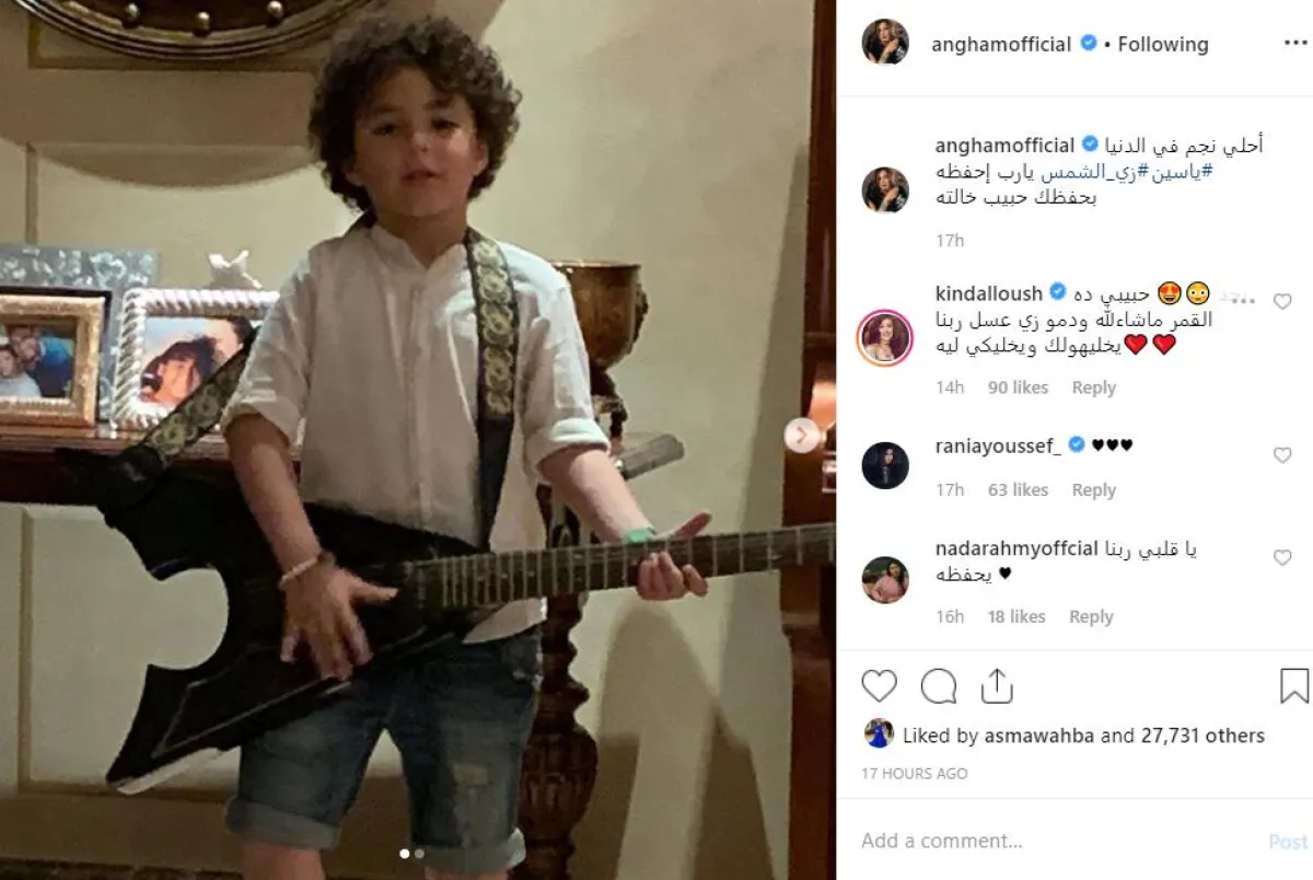 أنغام شاركت جمهورها عبر حسابها بموقع انستقرام صورًا عدة للصغير ياسين، وعلقت عليها قائلة: أحلى نجم في الدنيا.. ياسين زيّ الشمس..يارب احفظه بحفظك حبيب خالته.
