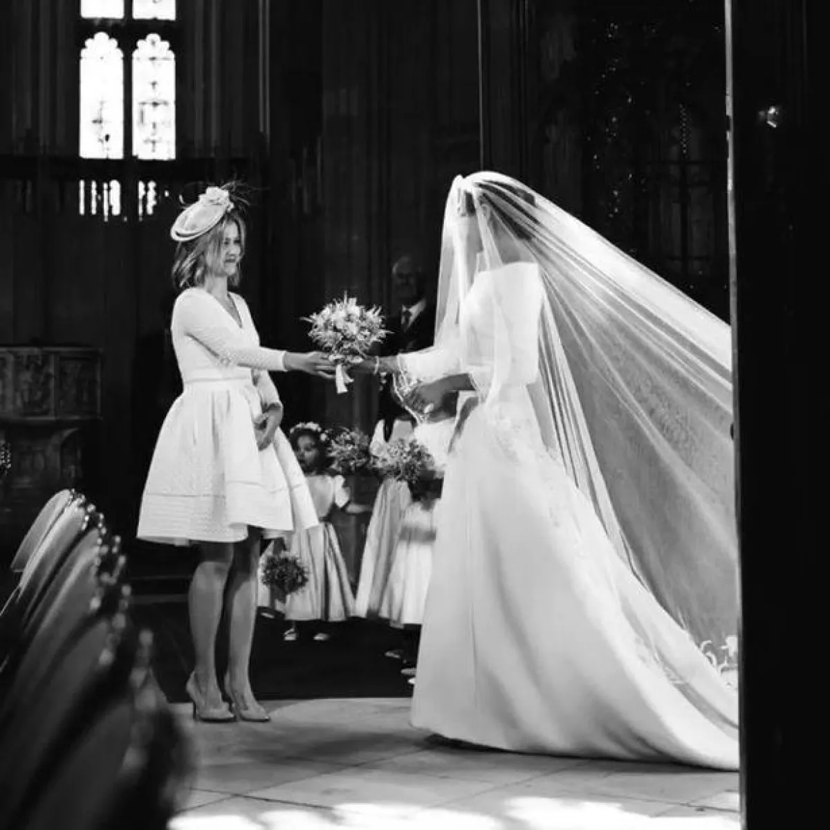 وبينما تنتظر ميغان في الدهليز بدء عزف الموسيقى، تشق صديقتها طريقها إلى الممر وتتسلم الباقة الصغيرة قبل أن تعود بأمان إلى مكانها.