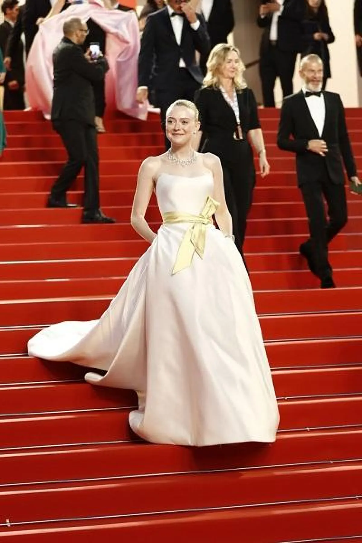 - تألّقت النجمة داكوتا فانينغ Dakota Fanning بفستان راقٍ ذي قصّة أميرية باللون العاجي، ونسّقت معه طقمًا فاخرًا من الألماس من دار شوبارد Chopard العريقة.