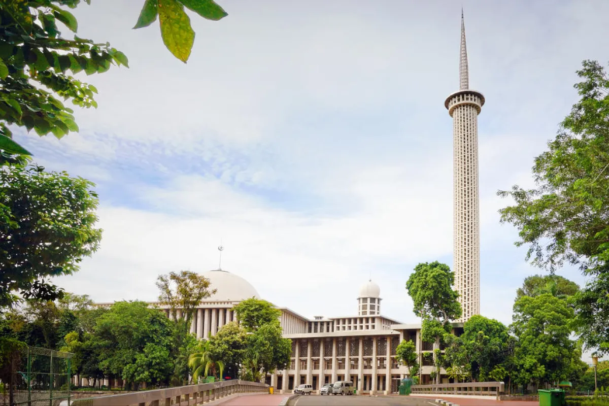 يقع هذا المسجد في ساحة "مارديكا"، وهو يعدُّ من معالم جاكرتا الرئيسة، والأكثر كبرًا في شرق آسيا، والمسجد الثامن الأكبر على مستوى العالم لناحيتَيْ المساحة والطاقة الاستيعابيَّة، إذ يستوعب نحو 200 ألف مصلّ. يبلغ طول المسجد 50 مترًا وعرضه 55 مترًا، أمَّا ارتفاعه فيبلغ 33 مترًا. ولهذا المسجد قبَّتان، قطر القبَّة منها 45 مترًا، ومئذنة بطول 90 مترًا. وسقف المسجد مُزدان بالزخارف الإسلاميَّة. وفي الواجهة الرئيسية حيث اتجاه القِبلة، كُتب لفظ الجلالة بالخطِّ العربي في جانب، وفي الجانب الآخر اسم النبي محمَّد (صلعم). ويقرب المسجد من محطَّة "جامبير" للقطار.