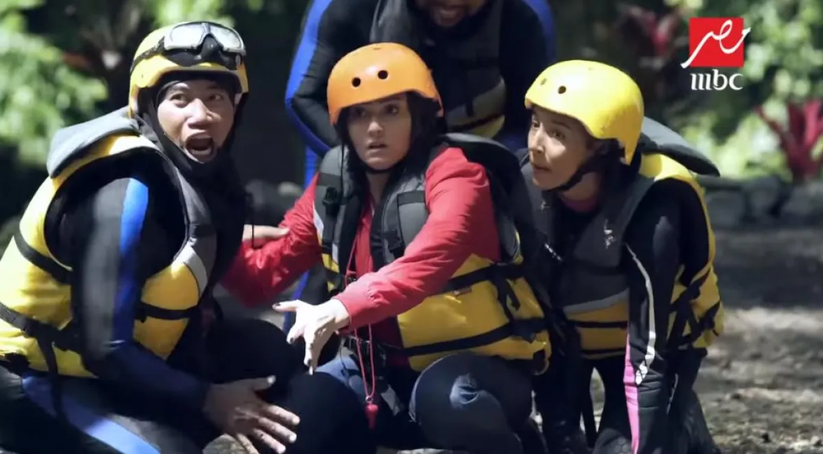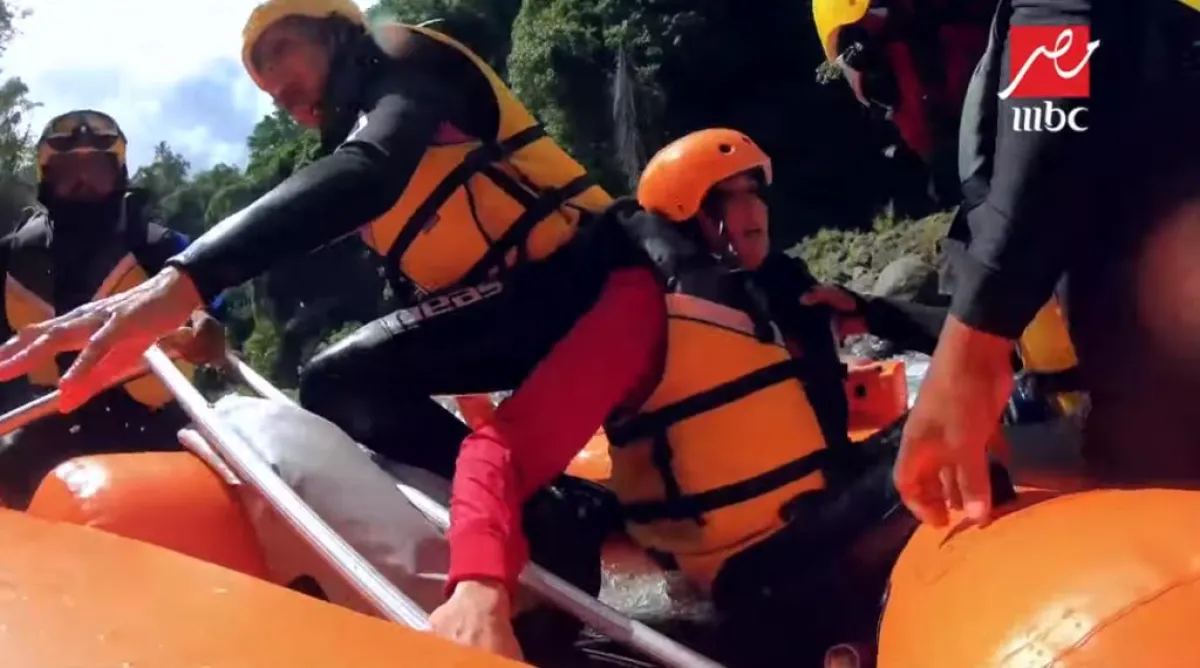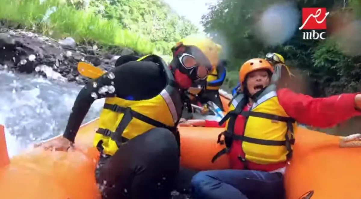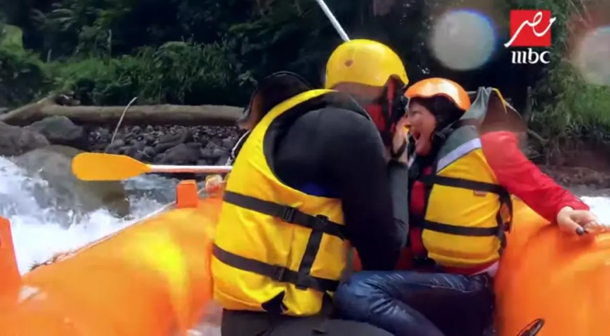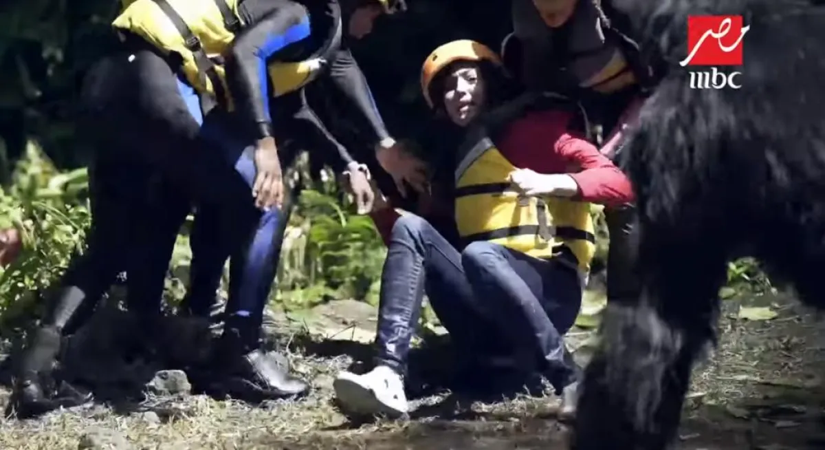 بشرى سقطت من أعلى كوبري معلق فوق الماء، وصرخت طالبة النجدة فور سقوطها في المياه، وبعد غرق المركب بالمياه ظلت تصرخ لرامز جلال المتخفي بزي فريق الإعداد قائلة: أبوس إيدك نزلني.