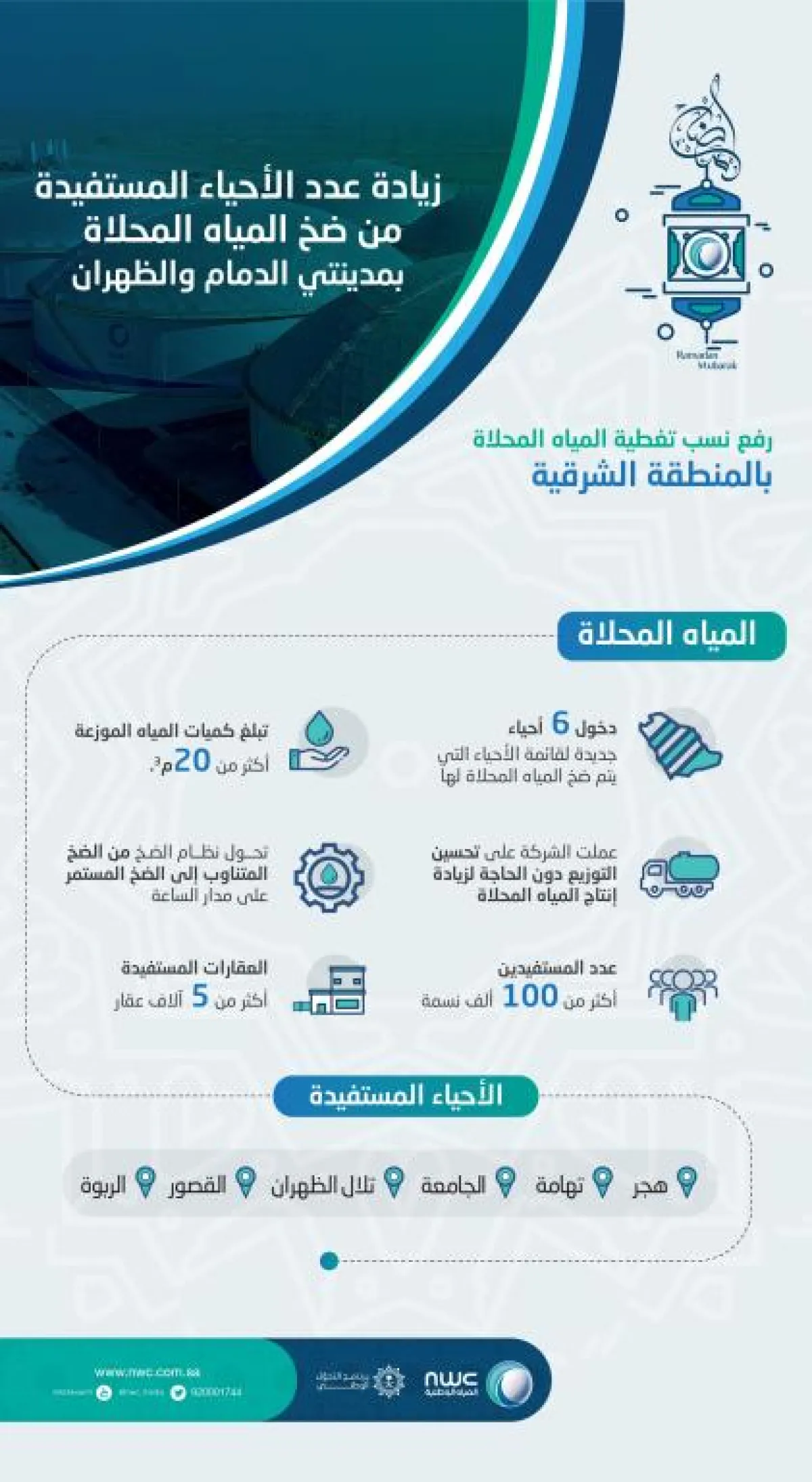 أعلنت الإدارة العامة لخدمات المياه بالمنطقة الشرقية عن بدء ضخ المياه المحلاة لستة أحياءٍ بالدمام والظهران هي: هجر، تهامة، الجامعة، الربوة، القصور، وتلال الظهران، وتزويدها بكميات من المياه تقدر بـ (20) ألف متر مكعب يوميًا دون أي زيادة في الكميات اليومية من قطاع الإنتاج؛ بعد تبني فريق هندسي وفني بالإدارة العامة للمياه خطة ذاتية توسعية وتنظيمية تم تنفيذها.